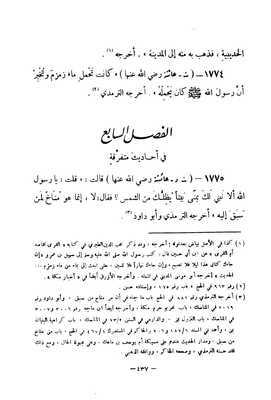1774 - (ت) عائشة -رضي الله عنها- «كانت تَحْمل ماءَ زمزمَ وتُخْبِرُ أنَّ رسولَ الله -صلى الله عليه وسلم- كان يَحْمِلُهُ» . أخرجه الترمذي (¬1) .