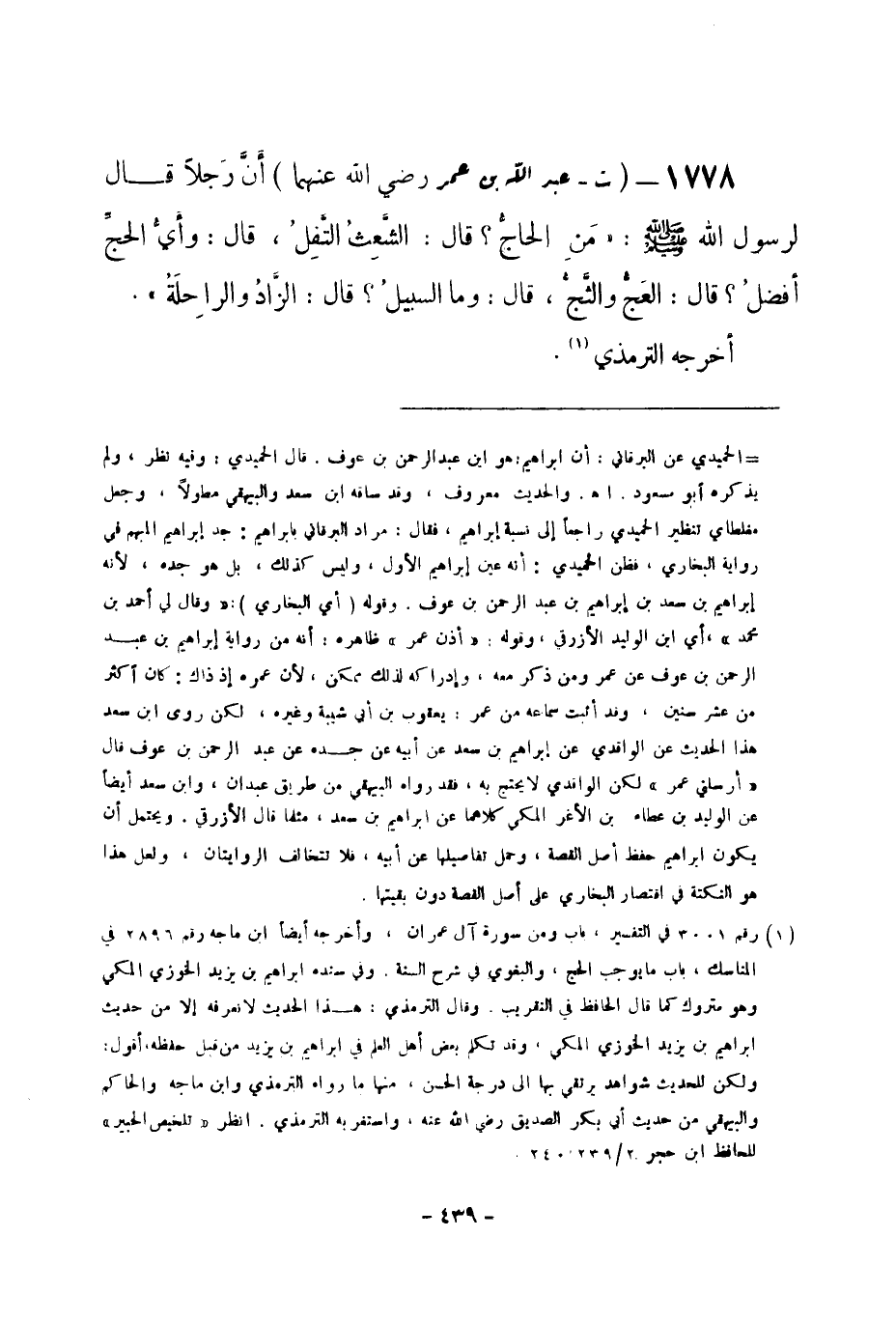 1778 - (ت) عبد الله بن عمر -رضي الله عنهما- أنَّ رَجلاً قال لرسول الله -صلى الله عليه وسلم-: «مَنِ الحاجُّ؟ قال: الشَّعِثُ التَّفِلُ، قال: وأَيُّ الحجَّ أفضلُ؟ قال: العَجُّ والثَّجُّ، قال: وما السبيلُ؟ قال: الزَّادُ والراحِلَةُ» . أخرجه الترمذي (¬1) . -[440]-