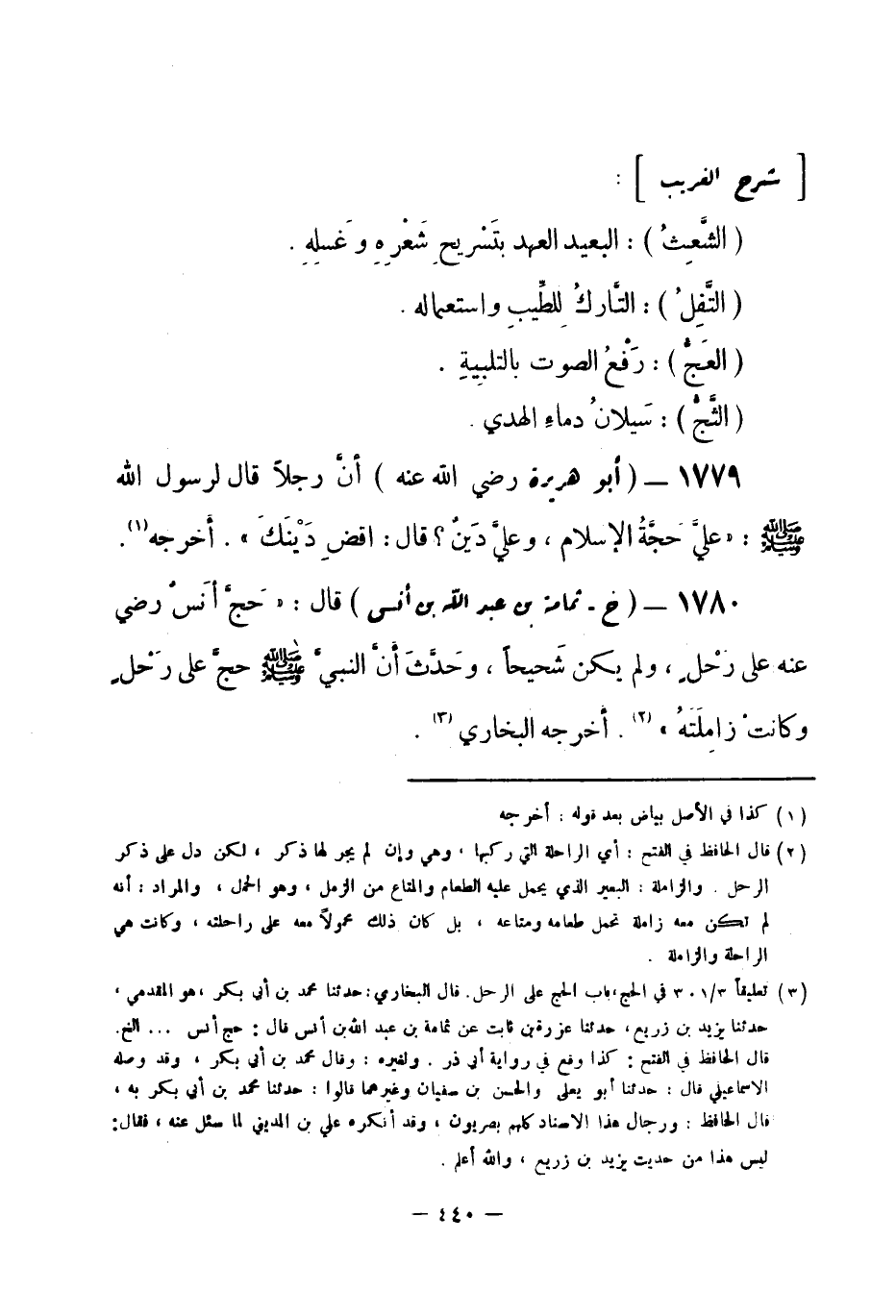 1779 - () أبو هريرة - رضي الله عنه - أنَّ رجلاً قال لرسول الله -صلى الله عليه وسلم-: «عليَّ حَجَّةُ الإسلام، وعليَّ دَينٌ؟ قال: اقضِ دَيْنَكَ» . أخرجه (¬1) .