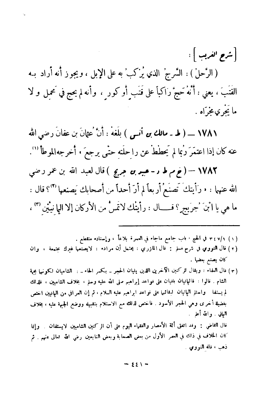 1781 - (ط) مالك بن أنس بلَغهْ: «أَنَّ عُثمانَ بن عفانَ -رضي الله عنه- كان إذا اعتمَرَ رُبما لم يَحطُطْ عن راحلَتهِ حتَّى يرجع» أَخرجَهُ الموطأ (¬1) .