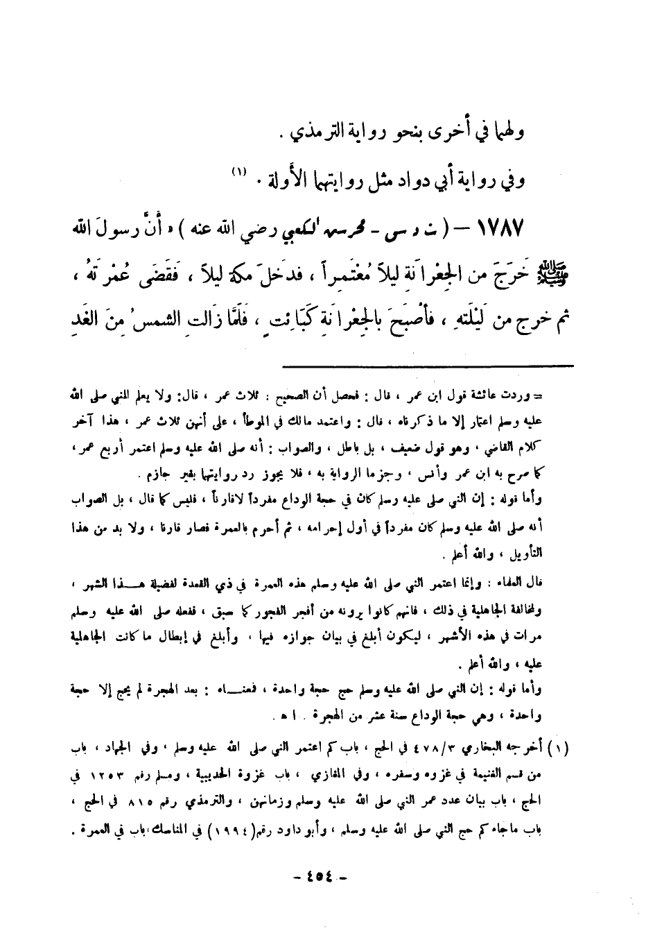 1787 - (ت د س) محرش الكعبي - رضي الله عنه - «أَنَّ رسولَ الله -صلى الله عليه وسلم- خَرَجَ من الجِعْرانَةِ ليلاً مُعْتَمِراً، فدخَلَ مكة ليلاً، فَقَضَى عُمْرتَهُ، ثم خرج من لَيْلَتهِ، فأصْبَحَ بالجِعْرانَةِ كَبَائتٍ، فَلَمَّا زَالتِ الشمسُ مِنَ الغَدِ -[455]- خَرَجَ في بَطْنِ سرِفَ، حتَّى جَامَعَ (¬1) الطريقَ، طَريقِ جَمعٍ بِبَطْنِ سَرِفَ، فمن أجل ذلك خَفيَتْ عُمرَتُهُ على الناس»