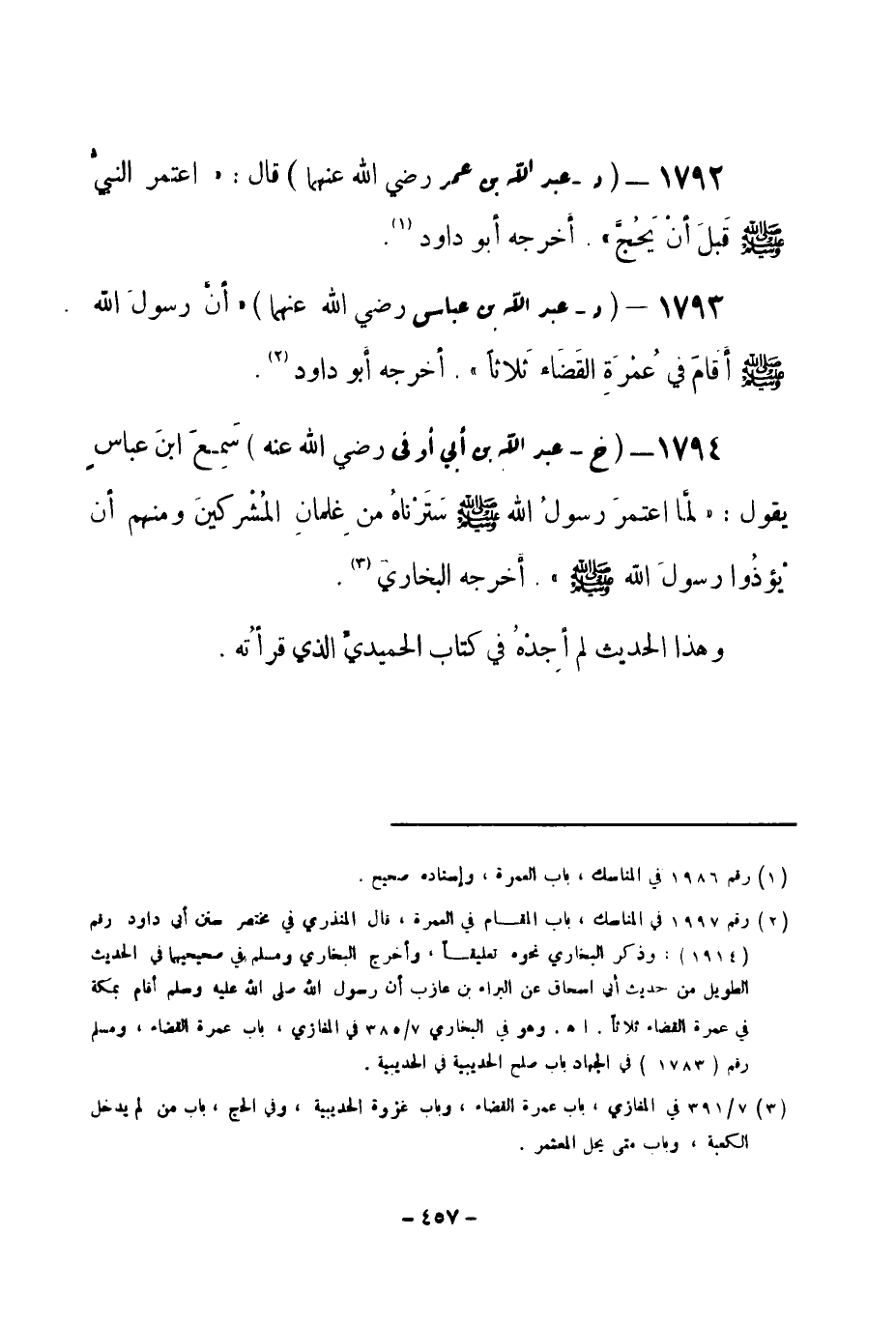 1793 - (د) عبد الله بن عباس -رضي الله عنهما- «أنَّ رسولَ الله -صلى الله عليه وسلم- أَقَامَ في عُمْرَةِ القَضَاء ثَلاثاً» . أخرجه أبو داود (¬1) .