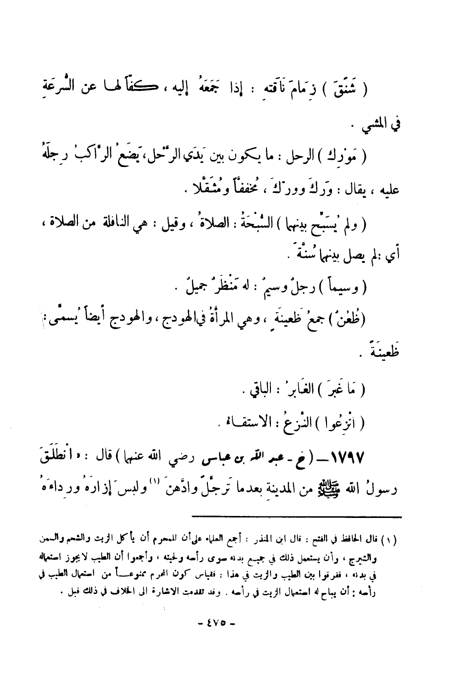 1797 - (خ) عبد الله بن عباس -رضي الله عنهما- قال: «انْطَلَقَ رسولُ الله -صلى الله عليه وسلم- من المدينةِ بعدما تَرجَّلَ وادَّهنَ (¬1) ولبسَ إزارَهُ ورِداءهُ -[476]- هُوَ وأَصحابُهُ، فلم ينه عن شيء من الأَرديةِ والأُزُرِ تُلبَسُ، إلاَّ المُزَعفَرَة (¬2) التي تُرْدَعُ (¬3) على الجلد. فَأصبَحَ بذي الحُلَيفَةِ، وركب راحلَتَهُ حتَّى استوى على البيداءِ أَهلَّ هو وأَصْحابهُ، وقَلَّدَ بُدْنهُ، وذلك لِخَمْسٍ بقينَ من ذي القَعْدة (¬4) فقدمَ مكةَ لأربعٍ خَلَون من ذي الحجَّةِ، وطافَ بالبيت، وسعى بين الصَّفَا والمروةِ، ولم يَحِلَّ من أجل بُدْنِهِ، لأنَّهُ قَلَّدها، ثم نزَلَ بأعلى مكةَ عند الحَجون (¬5) ، وهو مُهِلٌّ، ولم يَقْرَبِ الكَعْبَةَ بعد طوافِهِ بها حتى -[477]- رَجَعَ من عَرفةَ، وأمرَ أَصحابَهُ أن يَطوفوا بالبيت، وبين الصَّفا والمروة، ثم يُقَصِّرُوا رؤوسهُمْ ثم يَحِلُّوا (¬6) ، وذلك لَمِنْ لَم يكن مَعَهُ بَدَنَةٌ قَلَّدَها، ومَن كانت مَعهُ امْرَأته فهي لَهُ حَلالٌ والطِّيبُ والثيابُ» . أخرجه البخاري (¬7) .