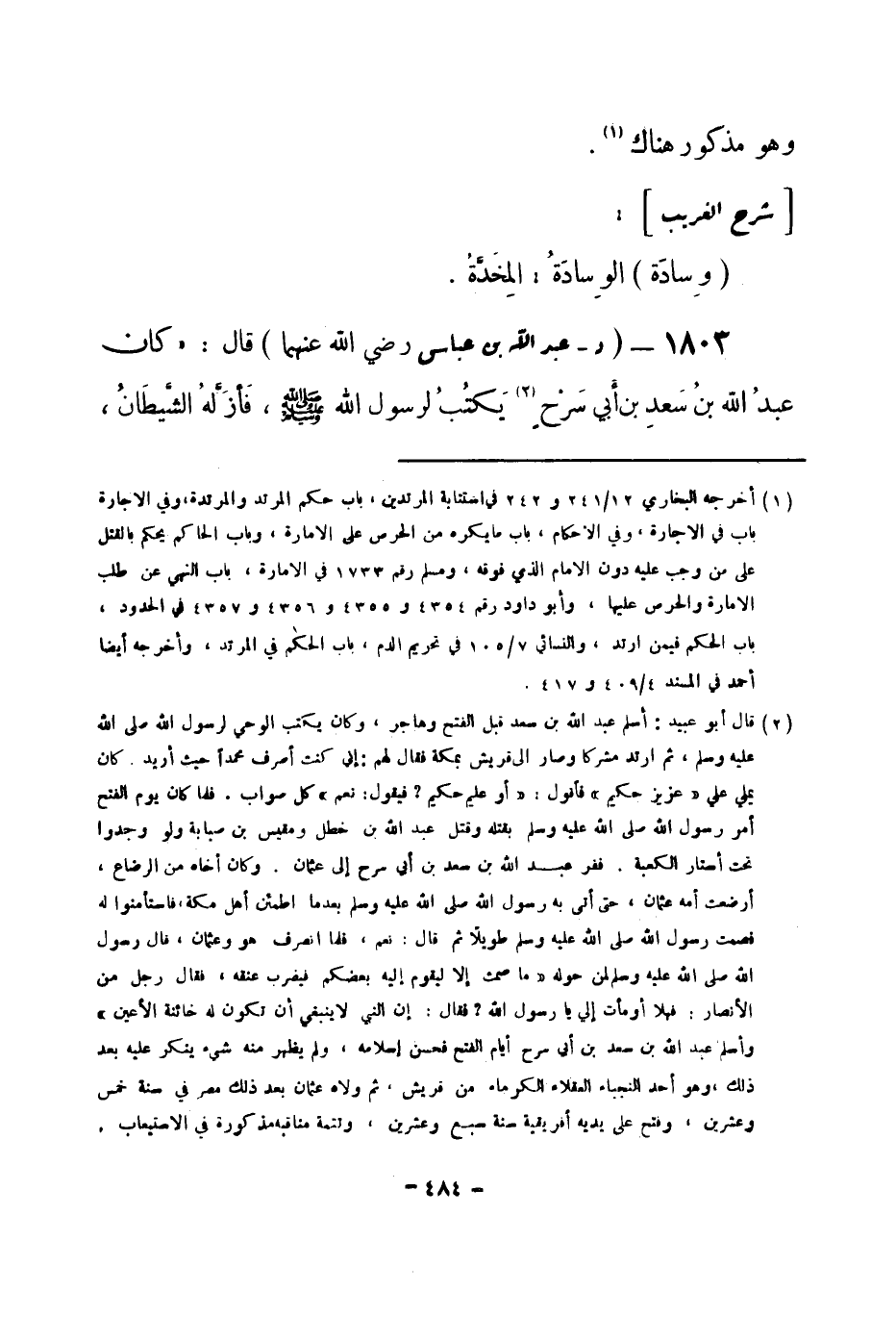 1803 - (د) عبد الله بن عباس -رضي الله عنهما- قال: «كان عبدُ الله بنُ سَعدِ بن أَبي سَرْحٍ (¬1) يَكتُبُ لرسول لرسول الله -صلى الله عليه وسلم-، فأزله الشَّيطَانُ، -[485]- فَلَحِقَ بالكُفَّارِ، فأمرَ رسولُ الله أنْ يُقْتَلَ يَومَ الفَتحِ، فاستَجَارَ له عُثمانُ ابنُ عَفَّانٍ، فأجارَهُ رسولُ الله -صلى الله عليه وسلم-» . أخرجه أبو داود.