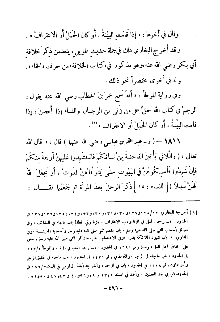 1811 - (د) عبد الله بن عباس -رضي الله عنهما- قال: قال الله تعالى: {والَّلاتي يَأْتِينَ الفاحشِةَ مِنْ نسائكُمْ فاسْتَشهِدوا عَليهنَّ أربعةً مِنكُمْ فإنْ شَهِدُوا فَأمسِكُوهُنَّ في البُيُوتِ حتَّى يَتَوفَّاهُنَّ المَوتُ أو يَجعَلَ الله لَهُنَّ سَبيلاً} [النساء: 15] ذكر الرجلَ بعدَ المرأة ثم جَمَعَهُما فقال: -[497]- {والَّلذانِ يأتيانها مِنْكم فآذُوهما فإن تابا وأصْلَحَا فَأَعْرِضُوا عَنهُما إنَّ الله كان تَوَّاباً رحيماً} [النساء: 16] فَنُسخَ ذلك بآية الجَلدِ، فقال: {الزَّانيةُ والزَّاني فَأجلدوا كلَّ وَاحدٍ منهما مِائةَ جَلدَةٍ ولا تأخذْكم بهما رأْفةٌ في دِينِ الله إنْ كُنتم تُؤمنونَ باللَّهِ واليَومِ الآخرِ وليَشهَدْ عَذَابَهُما طَائفةٌ من المُؤمنينَ} [النور: 2] هذه رواية أبي داود (¬1) .