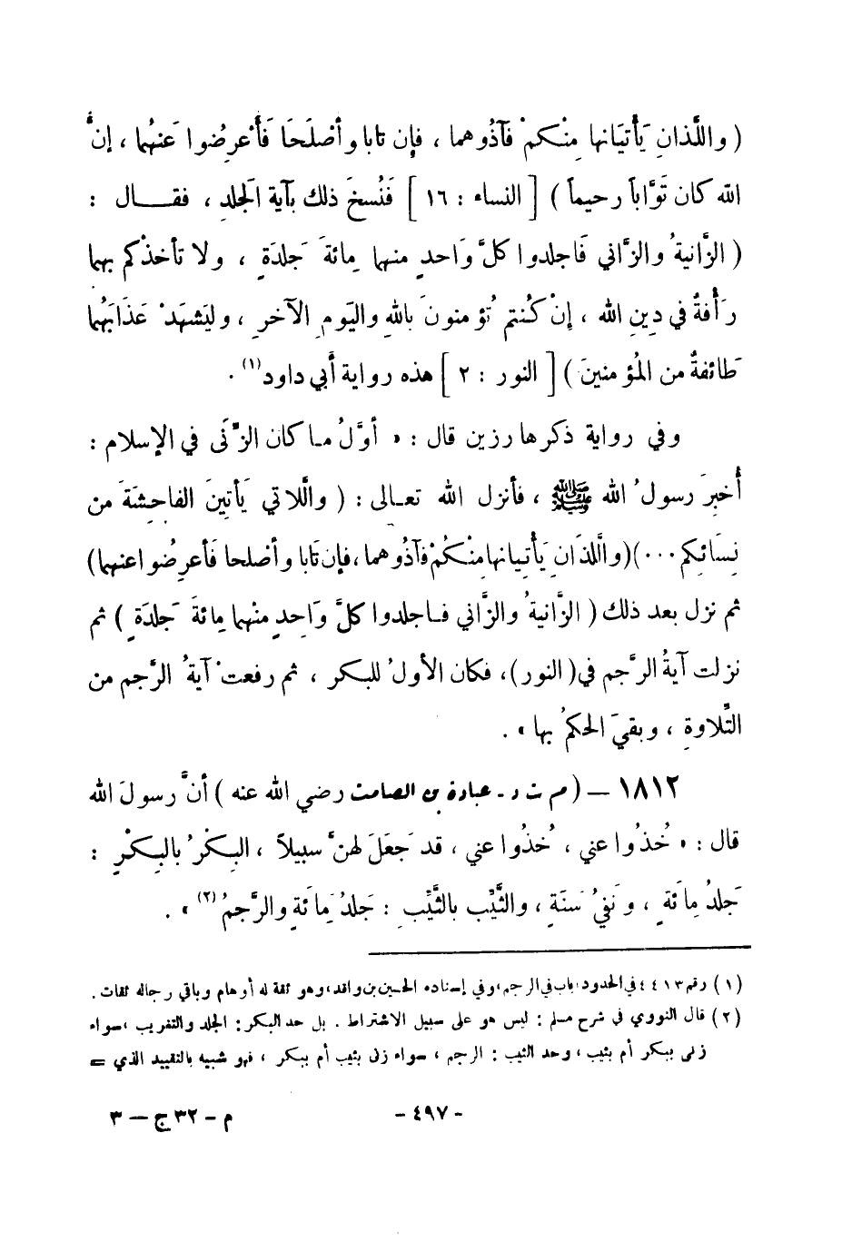 (¬2) أخرجه مسلم رقم (1960) في الحدود، باب حد الزنا، والترمذي رقم (1431) في الحدود، باب ما جاء في الرجم على الثيب، وأبو داود رقم (4415) و (4416) في الحدود، باب في الرجم.