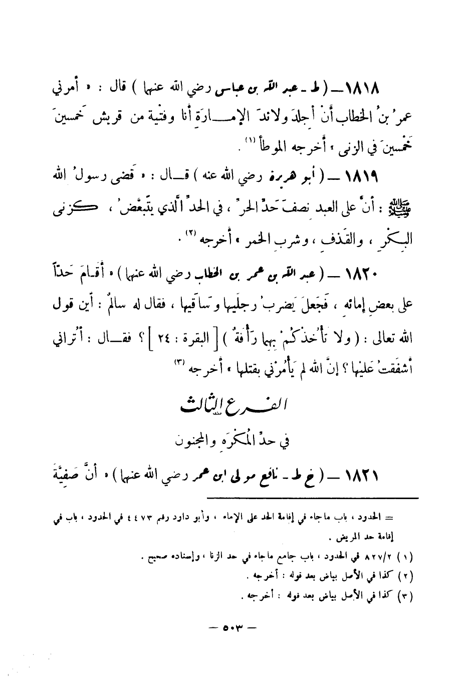 1821 - (خ ط) نافع مولى ابن عمر -رضي الله عنهما- «أنَّ صفِيَّة -[504]- بنتَ أبي عُبيدٍ (¬1) أخبَرتهُ: أنَّ عبداً من رقيقِ الإمارةِ وَقَعَ عَلى وليدةٍ من الْخُمُسِ، فاستَكرَهها حتى اقتَضَّها (¬2) فَجلَدَهُ عمر [الحدَّ ونفاه] (¬3) ، ولم يَجلدْها من أجل أنه استَكرَهها» هذه رواية البخاري (¬4) .