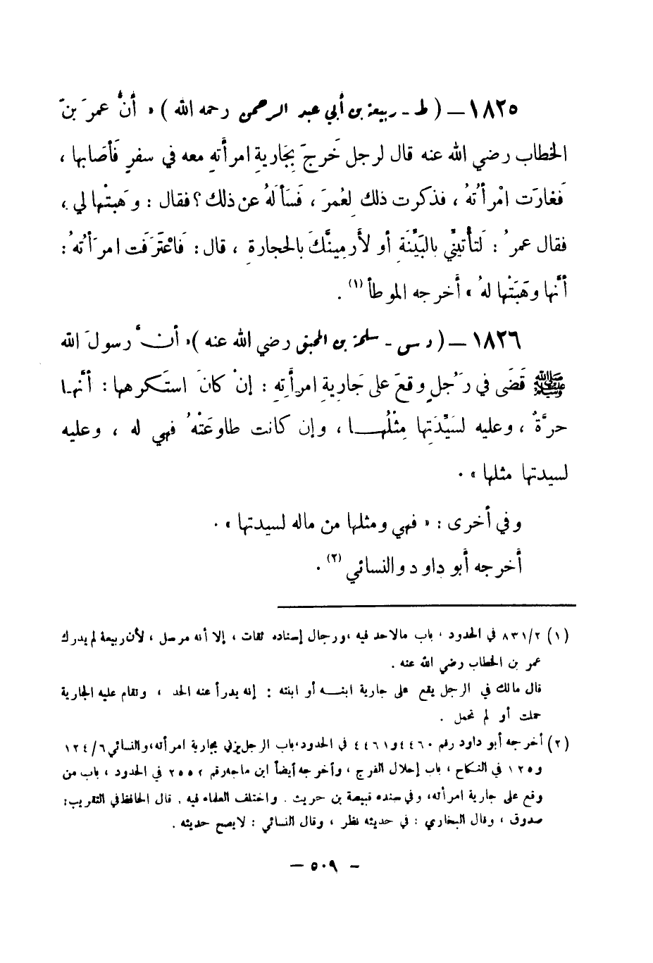 1826 - (د س) سلمة بن المحبق - رضي الله عنه - «أنَّ رسولَ الله -صلى الله عليه وسلم- قَضَى في رَجُلٍ وقعَ على جَاريةِ امرأَتِهِ: إنْ كانَ استَكرهها: أنَّها حرَّةٌ، وعليه لسَيِّدَتِها مِثْلُها، وإن كانت طاوعَتْهُ فهي له، وعليه لسيدتها مثلها» .