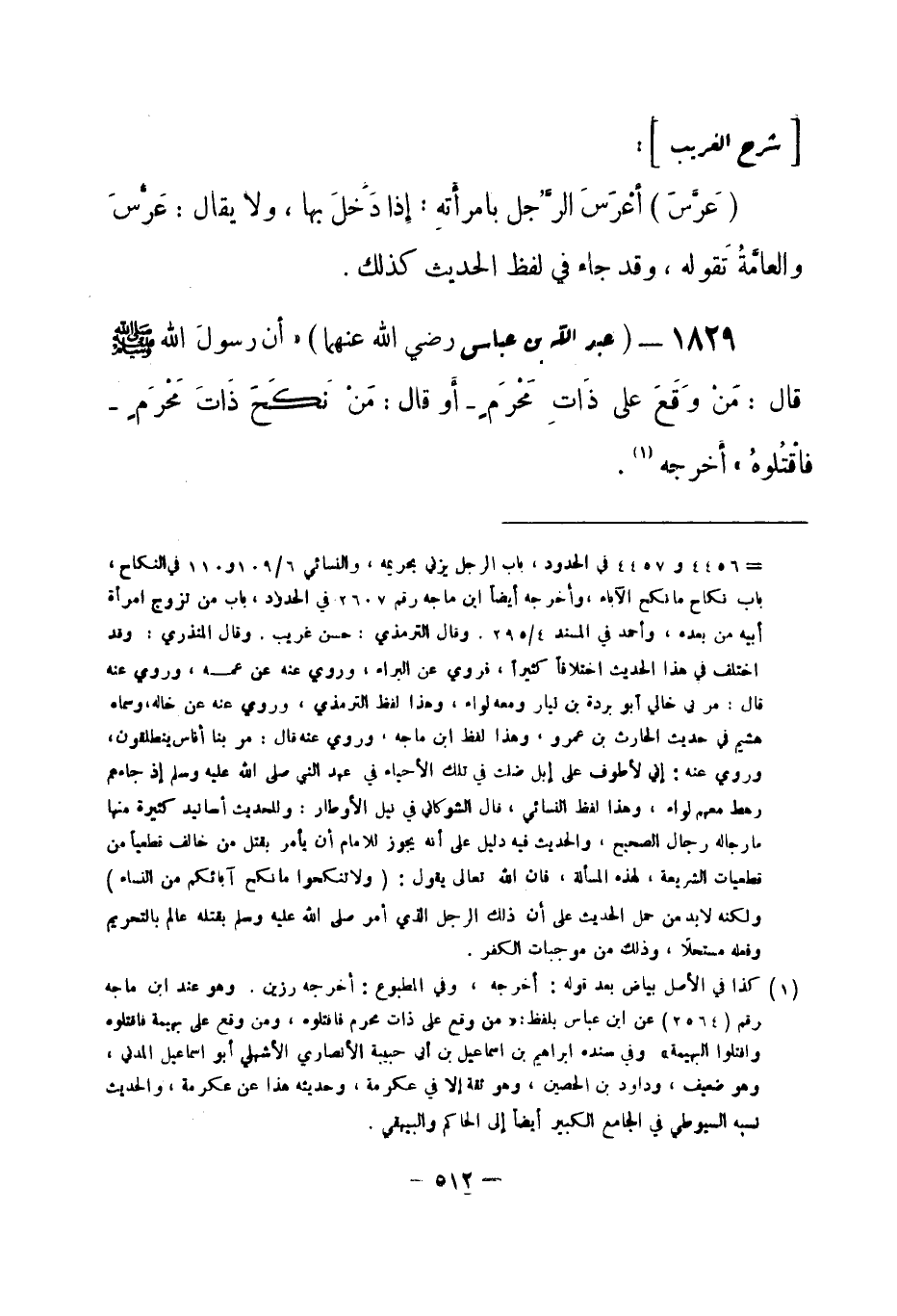 1829 - () عبد الله بن عباس -رضي الله عنهما- «أن رسولَ الله -صلى الله عليه وسلم- قال: مَنْ وَقَعَ على ذَاتِ مَحْرَمٍ - أو قال: مَنْ نَكَحَ ذَاتَ مَحْرَمٍ - فاقْتُلوهُ» . أخرجه (¬1) .