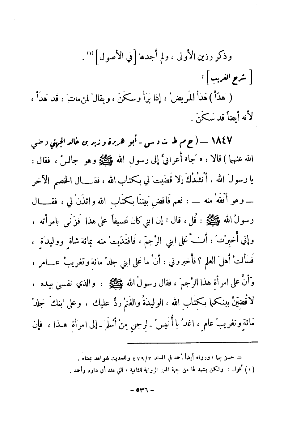 1847 - (خ م ط ت د س) أبو هريرة وزيد بن خالد الجهني -رضي الله عنهما- قالا: «جَاء أعرابيٌّ إلى رسولِ الله -صلى الله عليه وسلم- وهو جالسٌ، فقال: يا رسولَ الله، أنْشُدُكَ إلا قَضَيت لي بكتاب الله، فقال الخصم الآخر - وهو أفْقَهُ منه -: نعم فَاقضِ بَيننَا بكتَابِ الله وائذَنْ لي، فقال رسولُ الله -صلى الله عليه وسلم-: قُل، قال: إن ابني كان عَسيفاً على هذا فَزَنَى بامرأته، وإني أُخبِرْتُ: أَنَّ عَلى ابني الرَّجمَ، فَافتَدَيتُ منه بمائة شاةٍ ووليدَةٍ، فَسَألتُ أهلَ العلم؟ فأَخبروني: أَنَّ ما عَلى ابني جلدُ مائةٍ وتغريبُ عامٍ، وأنَّ على امرأةِ هذا الرَّجمَ، فقال رسولُ الله -صلى الله عليه وسلم-: والذي نفسي بيده، لا قْضِيَنَّ بينكما بكِتَابِ الله، الوليدَةُ والغَنمُ ردٌّ عليك، وعلى ابنكَ جَلدُ مَائةٍ وتغريبُ عامٍ، اغدُ يا أنَيسُ - لرِجلٍ مِنْ أسْلَمَ - إلى امرَأةِ هذا، فإن -[537]- اعُتَرَفَتْ فارْجمَها، فَغدَا عليها فاعترفتْ فأمَرَ بها رسولُ الله -صلى الله عليه وسلم- فرُجِمَت» .