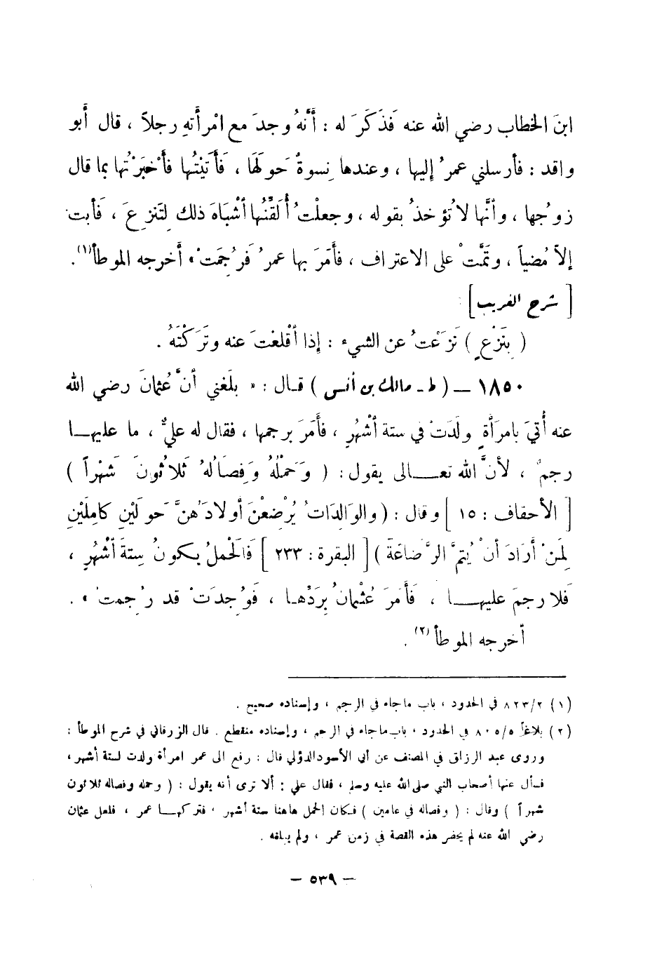 1850 - (ط) مالك بن أنس قال: «بلَغني أنَّ عُثمانَ -رضي الله عنه- أُتيَ بامرَأةٍ ولَدَتْ في ستة أشْهُرٍ، فأَمَرَ برجمها، فقال له عليٌّ، ما عليها رجمٌ، لأنَّ الله تعالى يقول: {وَحَمْلُهُ وَفِصَالُهُ ثَلاثُونَ شَهْراً} [الأحقاف: 15] وقال: {والوَالِدَاتُ يُرْضِعْنَ أولادَهُنَّ حَولَيْنِ كامِلَيْنِ لِمَنْ أرَادَ أنْ يُتمَّ الرَّضَاعَةَ} [البقرة: 233] فَالحَملُ يكون سِتةَ أشْهُرٍ، فلا رجمَ عليها، فَأَمرَ عُثْمانُ برَدِّها، فَوُجِدَتْ قد رُجِمتْ» . أخرجه الموطأ (¬1) .