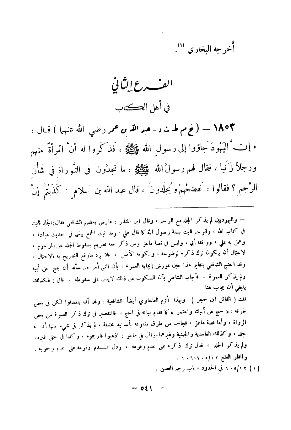 1853 - (خ م ط ت د) عبد الله بن عمر -رضي الله عنهما- قال: «إنَّ اليَهُودَ جَاؤوا إلى رسولِ الله -صلى الله عليه وسلم-، فَذَكَروا له أَنَّ امْرأة منهم ورجلاً زَنَيا، فقال لهم رسولُ الله -صلى الله عليه وسلم-: ما تَجدُون في التَّوراة في شَأْنِ الرَّجمِ؟ فقالوا: نَفضحُهمْ ويُجلَدونَ، قال عبد الله بن سَلامٍ: كَذَبتُمْ إنَّ -[542]- فيها الرَّجمَ، فأتَوا بالتوراةِ فَنشرُوها، فَوضَعَ أحَدُهُمْ يَدَهُ على آيَةِ الرَّجمْ، فَقْرَأ ما قَبْلها وما بَعْدهَا، فقال له عبد الله بن سَلامٍ: ارْفَعْ يَدَكَ، فَرَفَعَ يَدَهُ، فإذا فيها آيةُ الرجمِ، فقالوا: صَدَقَ يا محمدُ، فيها آيةُ الرَّجْمِ، فأمَرَ بهما النبيُّ -صلى الله عليه وسلم- فَرُجِما، قال: فرأيتُ الرَّجُلَ يُجْنِىءُ على المرأةِ يَقِيها الحجارةَ» .