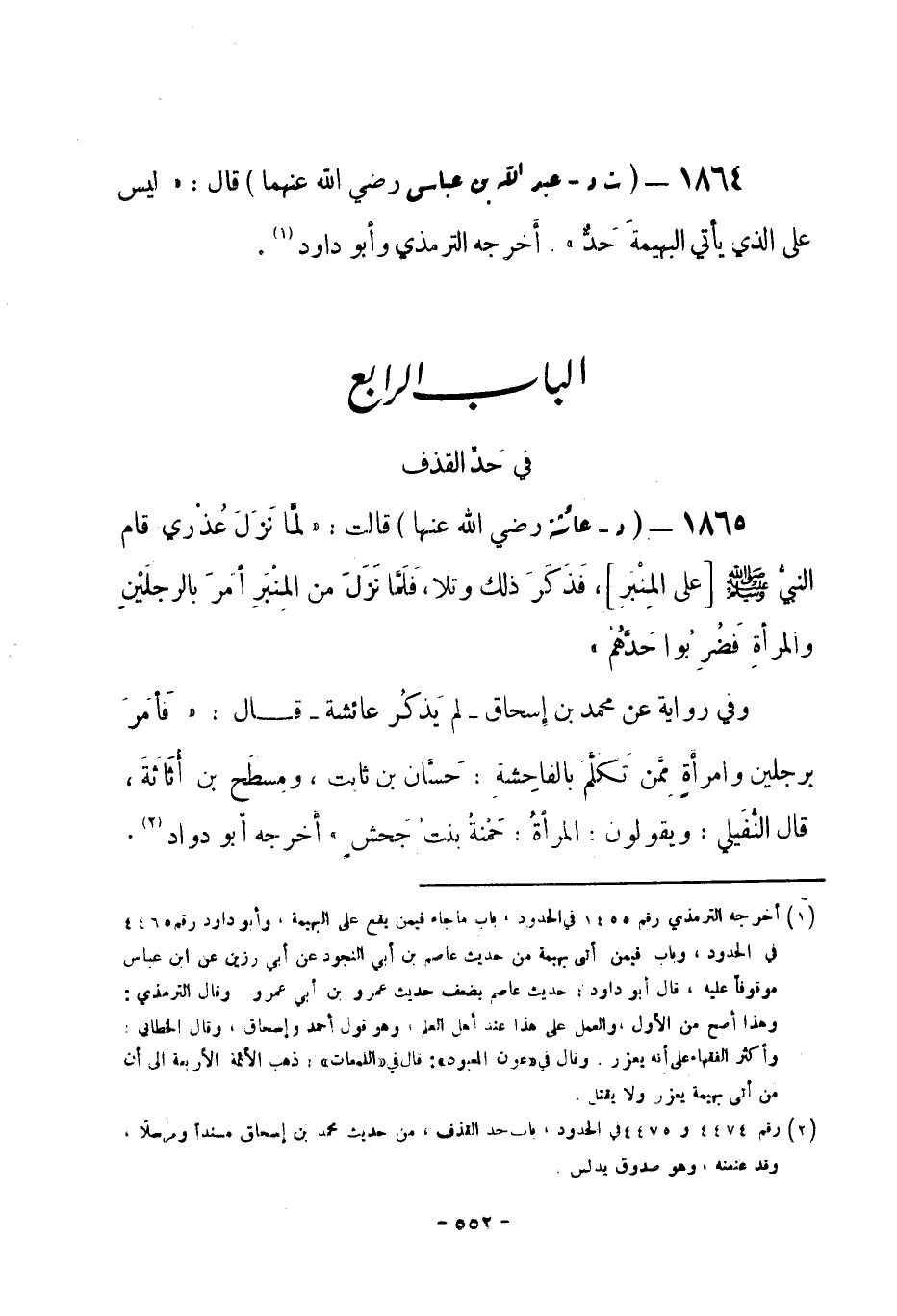 1864 - (ت د) عبد الله بن عباس -رضي الله عنهما- قال: «ليس على الذي يأتي البهيمةَ حَدٌّ» . أخرجه الترمذي وأبو داود (¬1) .