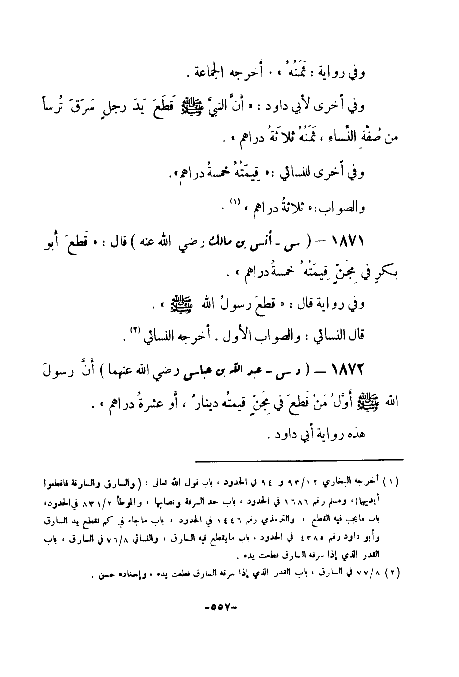1871 - (س) أنس بن مالك - رضي الله عنه - قال: «قَطعَ أَبو بكرٍ في مِجَنٍّ قِيمَتُهُ خمسةُ دراهم» . وفي رواية قال: «قطعَ رسولُ الله -صلى الله عليه وسلم-» .