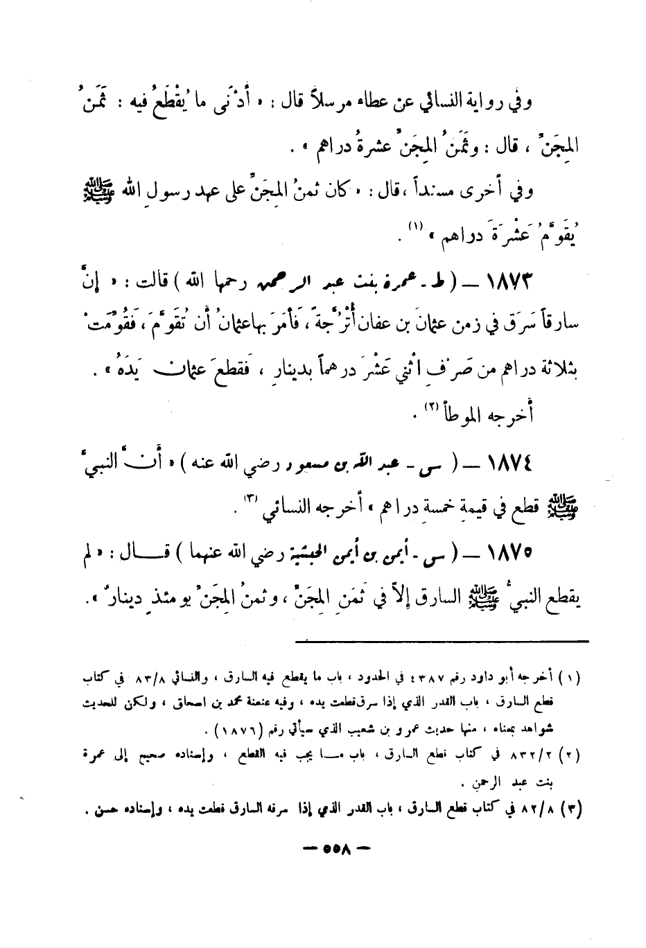 1874 - (س) عبد الله بن مسعود - رضي الله عنه - «أنَّ النبيَّ -صلى الله عليه وسلم- قطع في قيمةِ خمسةِ دراهم» .أخرجه النسائي (¬1) .
