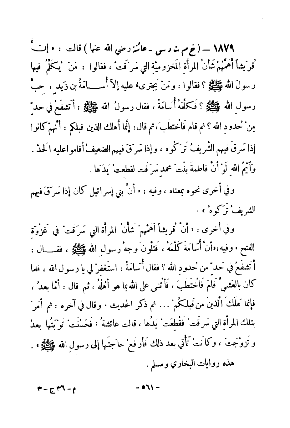 1879 - (خ م ت د س) عائشة -رضي الله عنها- قالت: «إنَّ قُرَيشاً أَهَمَّهُمْ شَأنُ المرأَةِ المَخزوميَّةِ التي سَرَقَتْ، فقالوا: مَنْ يُكلّمُ فيها رسولَ الله -صلى الله عليه وسلم-؟ فقالوا: ومَنْ يَجترئُ عليه إلا أُسامَةُ بن زَيدٍ، حِبُّ رسولِ الله -صلى الله عليه وسلم-؟ فَكلَّمَهُ أُسَامَةُ، فقال رسولُ الله -صلى الله عليه وسلم-: أتَشفَعُ في حدٍّ مِنْ حُدودِ الله؟ ثم قام فَاخْتطَبَ، ثم قال: إنَّما أَهلك الذين قبلكم: أنَّهمْ كانوا إذا سَرقَ فيهم الشَّريفُ تَرَكُوه، وإذا سَرَقَ فيهم الضعيف أقاموا عليه الحدّ. وَأيْمُ الله لَوْ أنَّ فاطمةَ بنْتَ محمدٍ سَرَقَت لقطعتُ يَدَهَا» .