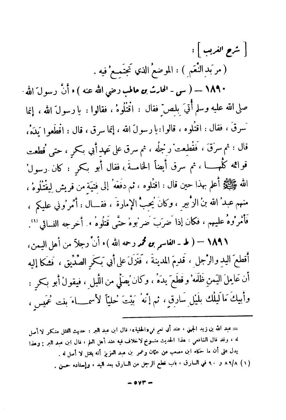 1890 - (س) الحارث بن حاطب - رضي الله عنه - «أَنَّ رسولَ الله، -صلى الله عليه وسلم- أُتيَ بِلِصٍّ فقال: اقْتُلُوهُ، فقالوا: يا رسولَ الله، إنما سَرقَ، فقال: اقتُلوه، قالوا: يا رسولَ الله، إنما سرق، قال: اقْطَعوا يَدَهُ، قال: ثم سرَقَ، فَقُطِعتْ رِجْلُه، ثم سرق على عَهدِ أبي بكرٍ، حتى قُطعت قوائمه كلُّها، ثم سرق أَيضاً الخامسةَ، فقال أَبو بكرٍ: كان رسولُ الله -صلى الله عليه وسلم- أعلم بهذا حين قال: اقتُلوه، ثم دَفَعَهُ إلى فتَيةٍ من قريش لِيقْتُلُوهُ، منهم عبدُ الله بنُ الزُّبيرِ، وكانَ يُحبُّ الإمارةَ، فقال: أَمِّرُوني عليكم، فَأمَّرُوه عليهم، فكان إذا ضَرَبَ ضَربُوهُ حتَّى قَتلُوهُ» . أخرجه النسائي (¬1) .