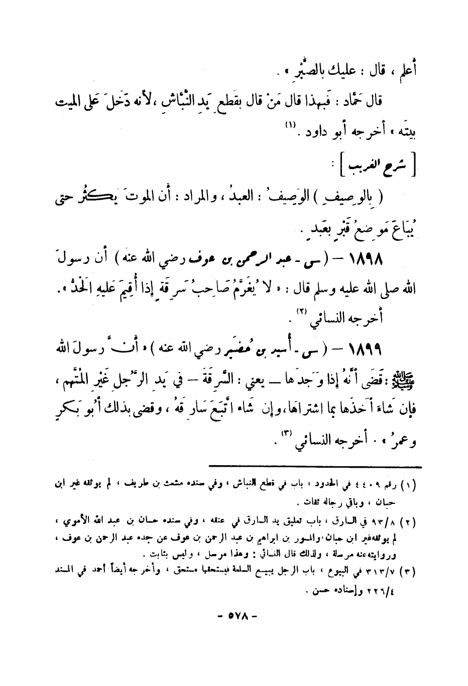 1898 - (س) عبد الرحمن بن عوف - رضي الله عنه - أن رسولَ الله -صلى الله عليه وسلم- قال: «لا يُغَرَّمُ صَاحِبُ سَرِقَةٍ إذا أُقِيمَ عَليهِ الحَدُّ» . أخرجه النسائي (¬1) .