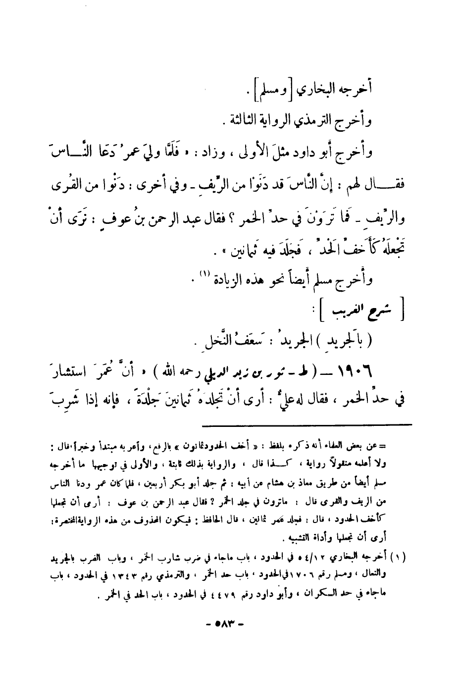 1906 - (ط) ثور بن زيد الديلي -رحمه الله- «أنَّ عُمَرَ استشارَ في حدِّ الخمر، فقال له عليٌّ: أرى أنْ تَجلدهُ ثَمانينَ جَلْدَة، فإنه إذا شَرِبَ -[584]- سَكِرَ، وإذا سَكِرَ هَذَى، وإذا هذَى افتَرَى، فَجَلَدَ عمرُ في حَدَّ الخمر ثمانين» . أخرجه الموطأ (¬1) .