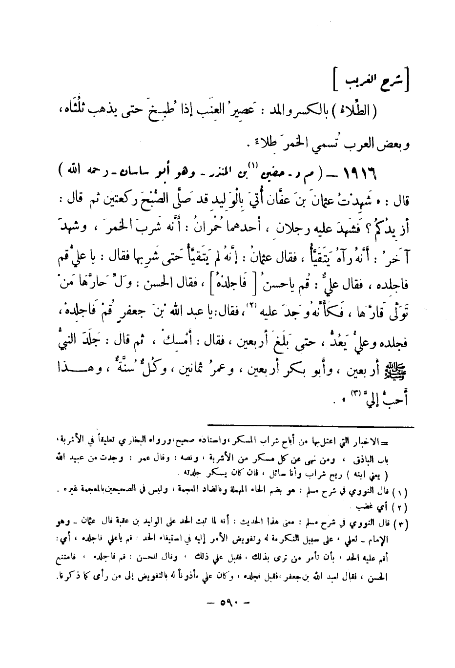 1916 - (م د) حضين (¬1) بن المنذر - وهو أبو ساسان -رحمه الله- قال: «شَهِدْتُ عثمانَ بنَ عفَّان أُتيَ بِالْوَلِيدِ قد صَلَّى الصُّبْحَ ركعتين ثم قال: أزيدُكُم؟ فَشهدَ عليه رجلان، أحدهما حُمْرانُ: أَنَّه شَربَ الخمرَ، وشهدَ آخرُ: أنَّهُ رآهُ يتقيِّأُ، فقال عثمانُ: إنَّهُ لم يتقيِّأُ حَتى شرِبها فقال: يا عليُّ قم فاجلده، فقال عليٌّ: قُم يا حسنُ [فاجلدُهُ] ، فقال الحسن: وَلِّ حارَّهَا مَنْ تولَّى قَارَّها، فَكأَنَّهُ وجدَ عليه (¬2) ، فقال: يا عبد الله بْنَ جعفرٍ قُمْ فَاجلدهُ، فجلده وعليٌّ يَعُدُّ، حتى بَلَغ أربعين، فقال: أمْسِكْ، ثم قال: جَلَدَ النبيُّ -صلى الله عليه وسلم- أربعين، وأبو بكر أربعين، وعمرُ ثمانين، وكُلُّ سُنَّةٌ، وهذا أحبُّ إليَّ (¬3) » . -[591]- أخرجه مسلم وأبو داود.