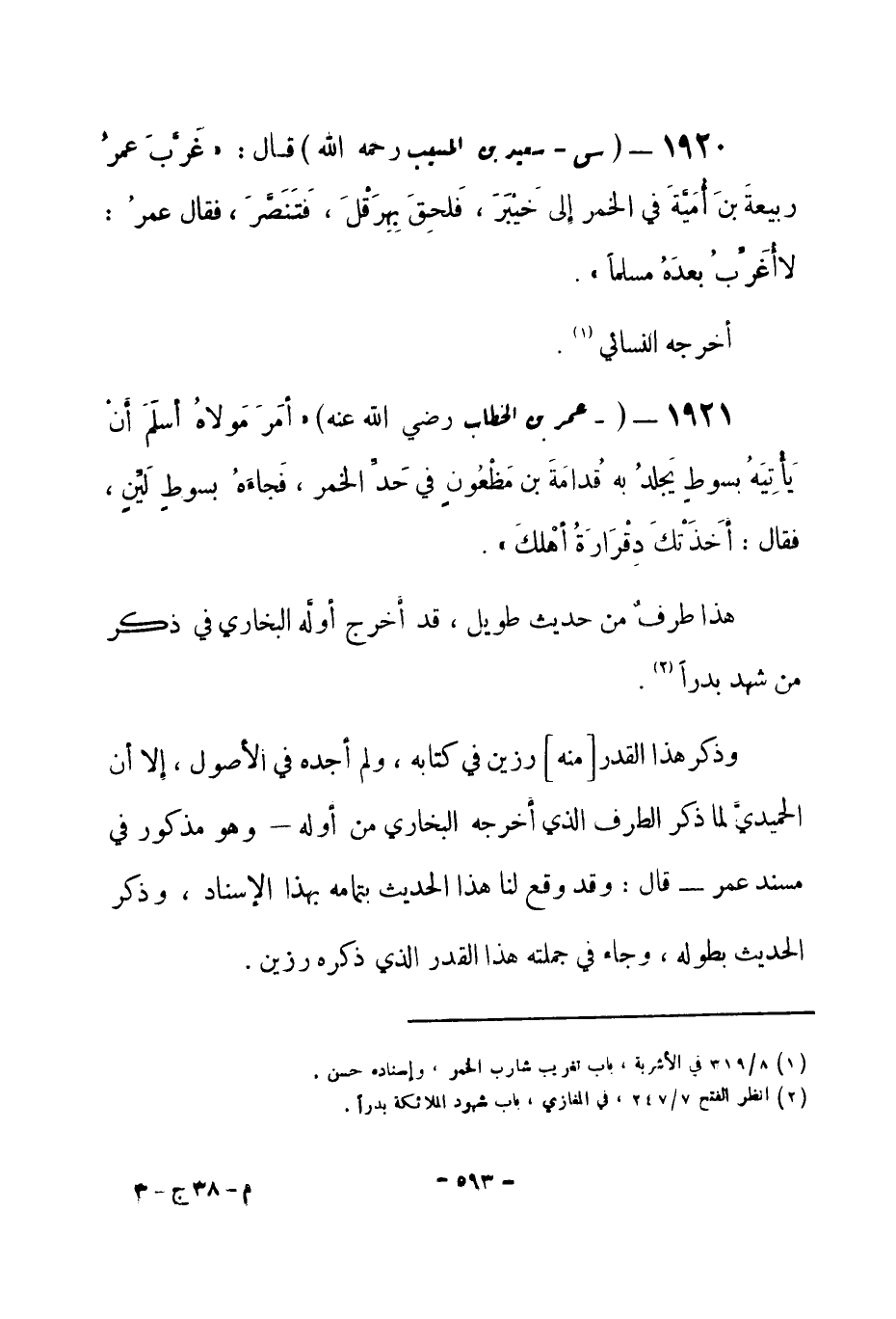 1920 - (س) سعيد بن المسيب -رحمه الله- قال: «غَرَّبَ عمرُ ربيعةَ بنَ أُمَيّةَ في الخمر إلى خيبر، فَلحِقَ بِهِرَقْلَ، فَتَنَصَّرَ، فقال عمرُ: لا أُغَرِّبُ بعدهُ مسلماً» . أخرجه النسائي (¬1) .