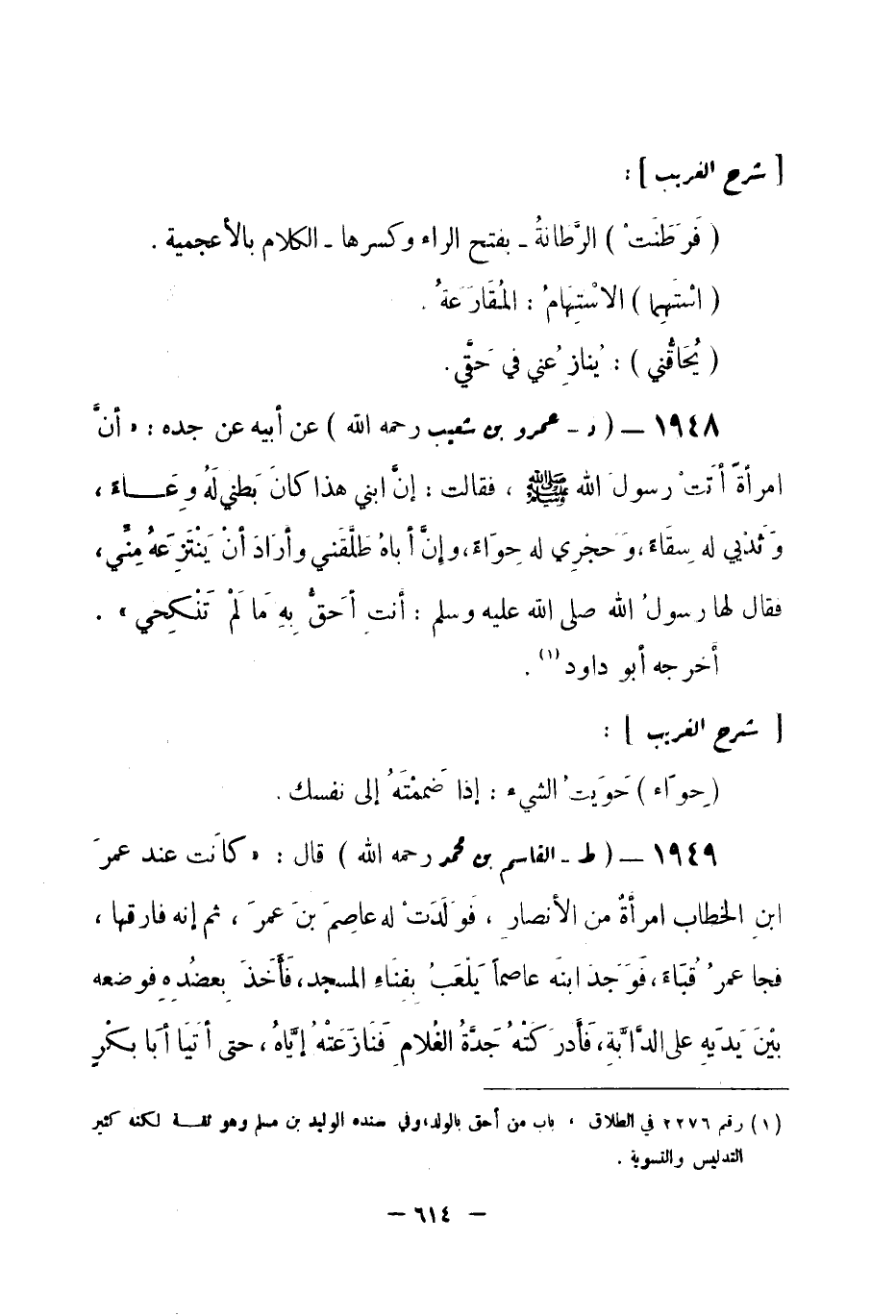 1948 - (د) عمرو بن شعيب -رحمه الله- عن أبيه عن جده: «أنَّ امرأةً أتَتَ رسولَ الله -صلى الله عليه وسلم-، فقالت: إنَّ ابني هذا كانَ بَطني لَهُ وِعَاءً، وَثديي له سقاءً، وحجري له حِوَاءً، وإنَّ أَباهُ طلَّقني وأراد أَنْ يَنْتَزِعَهُ مِنِّي، فقال لها رسولُ الله -صلى الله عليه وسلم-: أنتِ أَحَقُّ بِهِ مَا لَمْ تَنْكِحي» . أخرجه أبو داود (¬1) .
