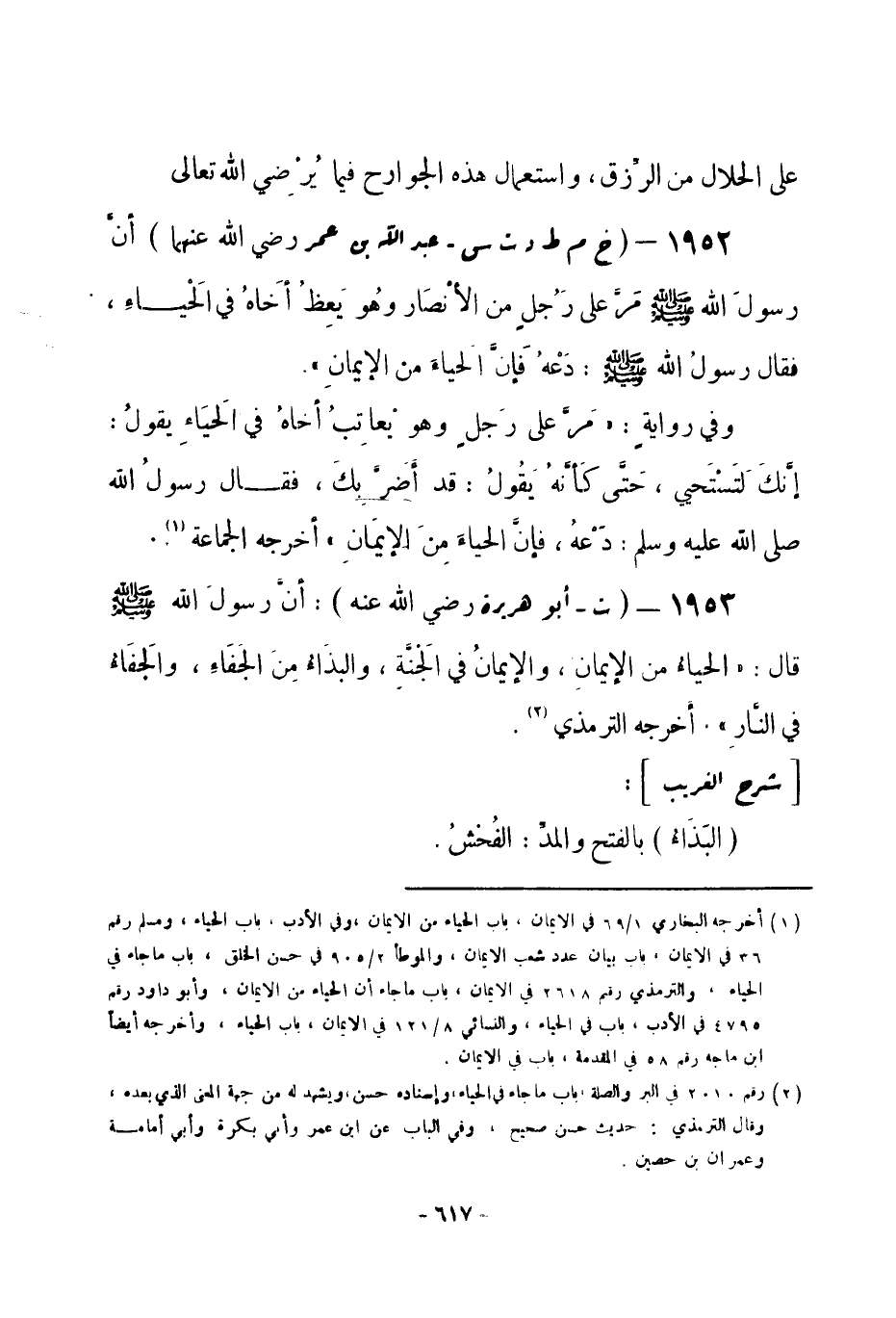(¬1) أخرجه البخاري 1 / 69 في الإيمان، باب الحياء من الإيمان، وفي الأدب، باب الحياء، ومسلم رقم (36) في الإيمان، باب بيان عدد شعب الإيمان، والموطأ 2 / 905 في حسن الخلق، باب ما جاء في الحياء، والترمذي رقم (2618) في الإيمان، باب ما جاء أن الحياء من الإيمان، وأبو داود رقم (4795) في الأدب، باب في الحياء، والنسائي 8 / 121 في الإيمان، باب الحياء، وأخرجه أيضاً ابن ماجة رقم (58) في المقدمة، باب في الإيمان.