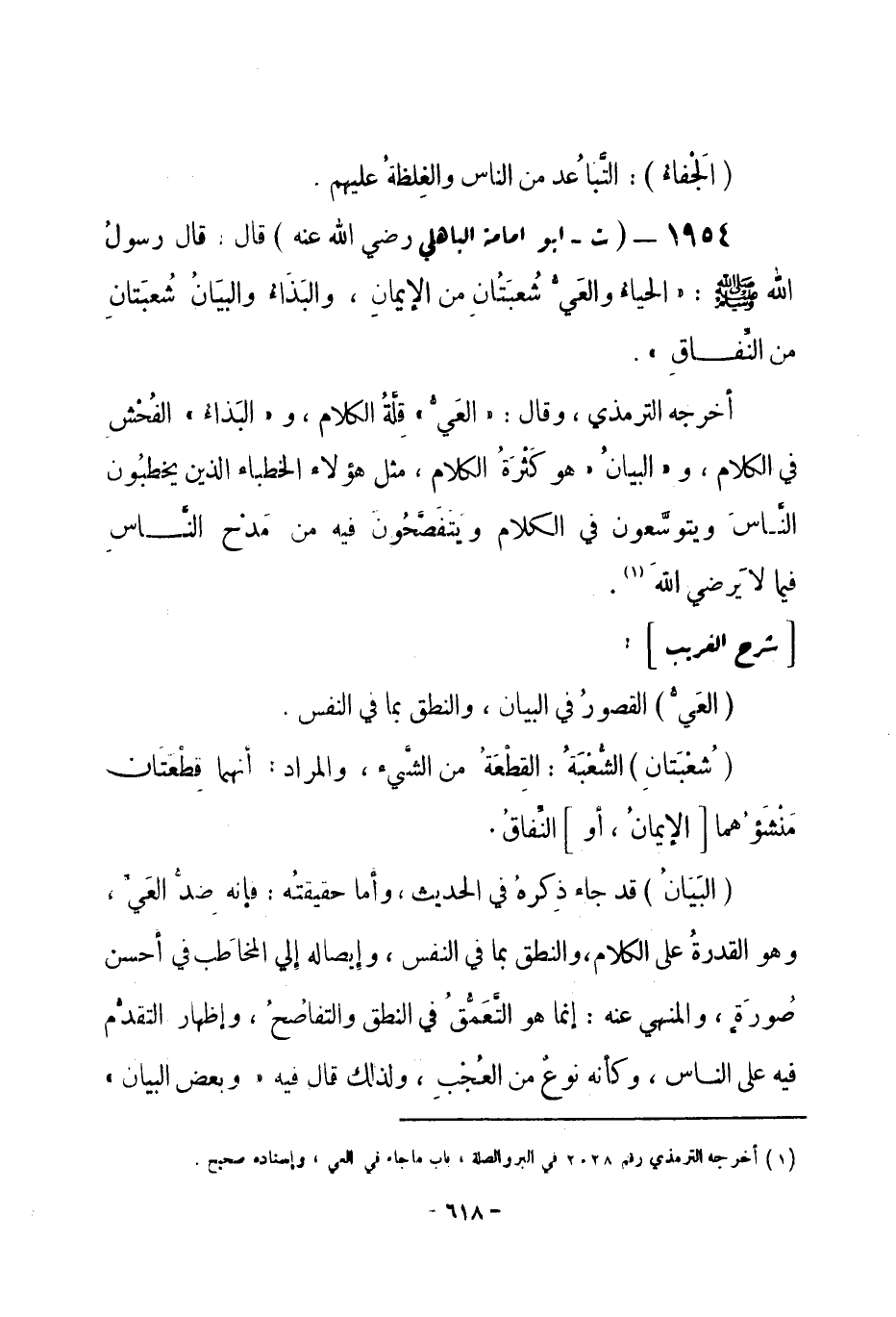 1954 - (ت) أبو أمامة الباهلي - رضي الله عنه - قال: قال رسولُ الله -صلى الله عليه وسلم-: «الحياءُ والعَيُّ شُعبَتُانِ من الإيمانِ، والبَذَاءُ والبيَانُ شُعبَتانِ من النِّفاقِ» .