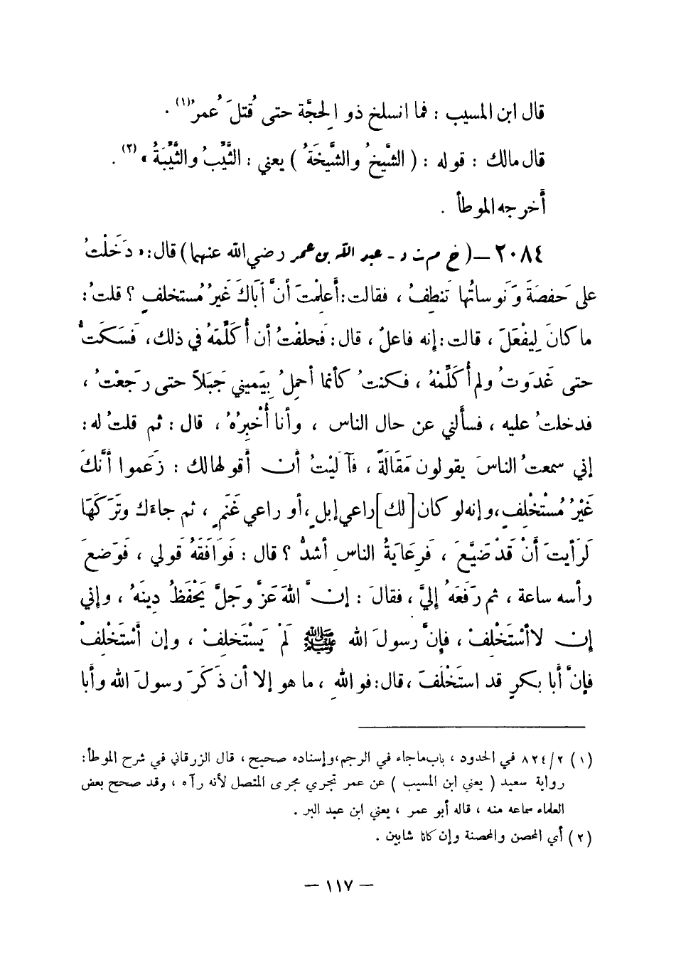 2084 - (خ م ت د) عبد الله بن عمر - رضي الله عنهما -: قال: «دَخَلْتُ على حَفصَةَ وَنَوساتُها تَنطِفُ، فقالت: أَعَلِمْتَ أنَّ أَبَاكَ غَيرُ مُستخلفٍ؟ قلتُ: ما كانَ لِيَفْعَلَ، قالت: إّنه فاعلٌ، قال: فَحلفْتُ أَن أُكَلِّمَهُ في ذلك، فَسَكَتُّ حتى غَدوَتُ ولم أُكَلِّمْهُ، فكنتُ كأنما أحمِلُ بِيَميني جَبَلاً حتى رَجعْتُ، فدخلتُ عليه، فسأَلني عن حال الناس، وأنا أُخْبِرُهُ، قال: ثم قلتُ له: إني سمعتُ الناسَ يقولون مَقَالَة، فآلَيْتُ أن أَقولها لك: زَعَموا أَنَّكَ غَيْرُ مُسْتَخْلِفٍ، وإنه لو كان [لك] راعي إبلٍ، أو راعي غَنَمٍ، ثم جاءك وتَرَكَهَا لَرَأيتَ أَنْ قَدْ ضَيَّعَ، فَرِعَايَةُ الناسِ أشدُّ؟ قال: فَوَافَقَهُ قَولي، فَوَضَعَ رأسه ساعة، ثم رَفَعَهُ إليَّ، فقالَ: إنَّ اللهَ عَزَّ وَجَلَّ يَحْفَظُ دِينَهُ، وإني إن لا أسْتَخْلِفْ، فإنَّ رسولَ الله - صلى الله عليه وسلم- لَمْ يَسْتَخلِفْ، وإن أَسْتَخْلِفْ فإنَّ أَبا بكرٍ قد استَخْلَفَ، قال: فواللهِ، ما هو إلا أن ذَكَرَ رسولَ الله، وأبا -[118]- بكرٍ، فعَلِمْتُ أنه لم يكن لِيعدِلَ برسولِ اللهِ أحداً، وأَنَّهُ غيرُ مُستَخلِفٍ» .