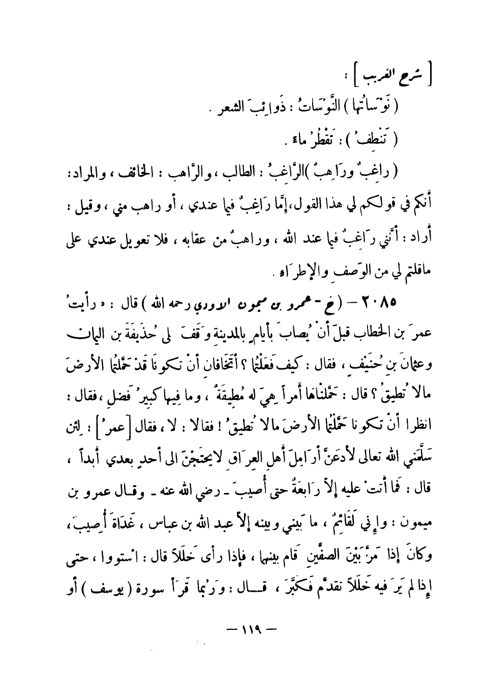 2085 - (خ) عمرو بن ميمون الأودي - رحمه الله -: قال: «رأَيتُ عمرَ بن الخطاب قبلَ أنْ يُصابَ بأيامٍ بالمدينةِ وَقَفَ على حُذَيفَةَ بن اليمان، وعثمانَ بنِ حُنَيْفٍ، فقال: كيف فَعَلْتُما؟ أَتَخَافانِ أنْ تكونَا قَدْ حَمَّلتُما الأرضَ ما لا تُطيقُ؟ قالا: حَمَّلنْاهَا أَمراً هِيَ له مُطِيقَةٌ، وما فِيها كبِيرُ فَضلٍ، فقال: انظرا أنْ تكونا حمَّلْتمُا الأرضَ ما لا تُطيقُ! ، فقالا: لا، فقال [عمرُ] : لئِن سَلَّمَني الله تعالى لأدَعنَّ أرَامِلَ أَهلِ العِرَاقِ لا يحتَجْنَ إلى أحدٍ بعدي أَبداً، قال: فَما أتتْ عليه إِلا رَابعَةُ حتى أُصيبَ - رضي الله عنه - وقال عمرو بن ميمون: وإِني لَقَائِمٌ، ما بَيني وبينه إلا عبد الله بن عباس، غَدَاةَ أُصِيبَ، وكانَ إذا مَرَّ بَيْنَ الصفَّينِ قَام بينهما، فإذا رأى خَلَلاً قال: اسْتووا، حتى إِذا لم يَرَ فيه خَلَلاً تقدَّمَ فَكَبَّرَ، قال: وَرُبما قَرَأ سورة (يوسف) أو -[120]- (النَّحْلِ) أو نحو ذلك في الرَّكعةِ الأُولى، حتى يجتمعَ الناسُ، فما هو إلا أَنْ كَبَّرَ، فسمعتُه يقول: قَتَلَني - أَو أَكَلَني - الكَلْبُ، حِينَ طَعَنَهُ، فَطارَ العِلجُ بسَكِّينٍ ذَاتِ طَرَفَيْنِ، لا يَمُرُّ على أَحَدٍ يميناً، ولا شِمَالاً إلا طَعَنَهُ، حتى طعنَ ثَلاثَةَ عشَر رَجُلاً، فماتَ منهم تِسعةٌ - وفي رواية: سَبْعَةٌ - فلما رأى ذلك رجلٌ من المسلمين طَرَحَ عليه بُرْنُساً، فلما ظَنَّ العِلْجُ أَنه مَأْخُوذٌ نَحَرَ نَفْسَهُ، وتنَاوَلَ عمرُ [يَدَ] عبدِ الرحمن بن عوفٍ فَقَدَّمَهُ (¬1) ، فَأمَّا مَنْ كَانَ يَلي عمرَ، فقد رأَى الذي رأَيتُ، وأمَّا نَواحِي المسجد، فإنهم لا يدْرونَ ما الأمْرُ؟ غيرَ أنهم [قد] فَقَدوا صَوتَ عمرَ، وهم يقولون: سبحان الله، سبحان الله، فَصَلَّى بهم عبدُ الرحمن بنُ عَوف صَلاة خَفيفَة، فلما انْصرَفُوا، قال: يا ابنَ عبَّاس، انظر: مَنْ قَتلَني؟ قال: فَجَالَ ساعة ثم جَاءَ، فقال: غُلامُ المُغِيرَةِ بن شُعبَةَ، فقال: آلصَّنَعُ؟ قال: نعم، قال: قَاتَلَهُ الله، لقد كُنتُ أَمَرتُ به معروفاً، ثم قال: الحمد لله الذي لم يَجْعلْ مِيتَتي (¬2) بيد رجل مسلمٍ، قد كنْتَ أنْتَ وأبوكَ تُحِبانِ أنْ تَكثُرَ العُلُوجُ بالمدينة - وكان العباسُ أَكثَرَهُمْ رَقيقاً - فقال ابنُ عباس: إنْ شئتَ فعلتُ (¬3) - أي: إن -[121]- شئتَ قَتَلْنَا- قال: [كَذَبتَ] (¬4) ، بَعدَما تَكلَّمُوا بِلِسَانِكم، وصَلَّوْا قِبْلَتَكم، وحَجُّوا حَجَّكم؟ فَاحْتُمِلَ إلى بَيتِهِ، فانطلقنا معه، قال: وكأنَّ الناسَ لم تُصِبْهُمْ مصيبةٌ قَبلَ يومِئذ، قال: فقائلٌ يقول: أَخَافُ عليه، وقَائِلٌ يقول: لا بأسَ، فَأُتيَ بنبيذٍ (¬5) فشَرِبَهُ، فَخَرجَ من جَوفِهِ، ثُمَّ أُتيَ بلَبَنٍ فَشَرِبَ منه، فخرجَ من جُرْحِهِ، فَعَرَفُوا أَنَّهُ مَيِّتٌ، قال: فدخلنا عليه، وجاء الناسُ يُثنونَ عليه (¬6) وجاء رجلٌ شابٌ فقال: أبشِر يا أمِيرَ المؤمنين ببُشْرى اللهِ - عزَّ وجل -، قد كانَ لك من صُحبَةِ رسولِ الله -صلى الله عليه وسلم-، وقَدَمٍ في الإسلام، ما قَد علمتَ، ثم وَلِيتَ فَعَدَلتَ، ثم شَهَادَةٌ، فقال: وَدِدتُ أَنَّ ذلك كانَ كفافاً، لا عَلَيَّ، ولا لي، فلما أَدْبَرَ الرَّجُلُ إذا إِزَارُهُ يَمَسُّ الأرضَ، فقال: رُدُّوا عَليَّ الغُلامَ، فقال: يا ابْنَ أَخي، ارْفَع ثَوبَكَ فإنه أَبقى (¬7) لِثَوبِكَ، وأَتقَى لربِّكَ (¬8) ، يا عبدَ الله انْظر ما عَليَّ من الدَّينِ، -[122]- فَحَسَبُوهُ فَوجدوه سِتَّة وثمانينَ أَلفاً، أو نحوه (¬9) ، فقال: إِن وَفَى به مالُ آلِ عمر فَأدِّهِ من أَموالهم، وإلا فَسلْ في بني عَدِيِّ بنِ كَعب، فإنْ لم تَف أموالُهُم فَسَلْ في قُرَيشٍ، ولا تَعْدُهُمْ إِلى غيرهم، وأَدِّ عَني هذا المالَ، انْطَلق إِلى أُمِّ المؤمنين عائشةَ، فقل: يَقْرَأُ عليكِ عمرُ السلامَ، ولا تَقلْ: أميرُ المؤمنين، فَإِني لَستُ اليَومَ للمؤمنين أَميراً، وقلْ: يستَأذِنُ عمرُ بنُ الخطاب أَن يُدفَنَ مَعَ صَاحِبَيْهِ، قال: فسَلَّمَ واستَأذَنَ، ثم دخ