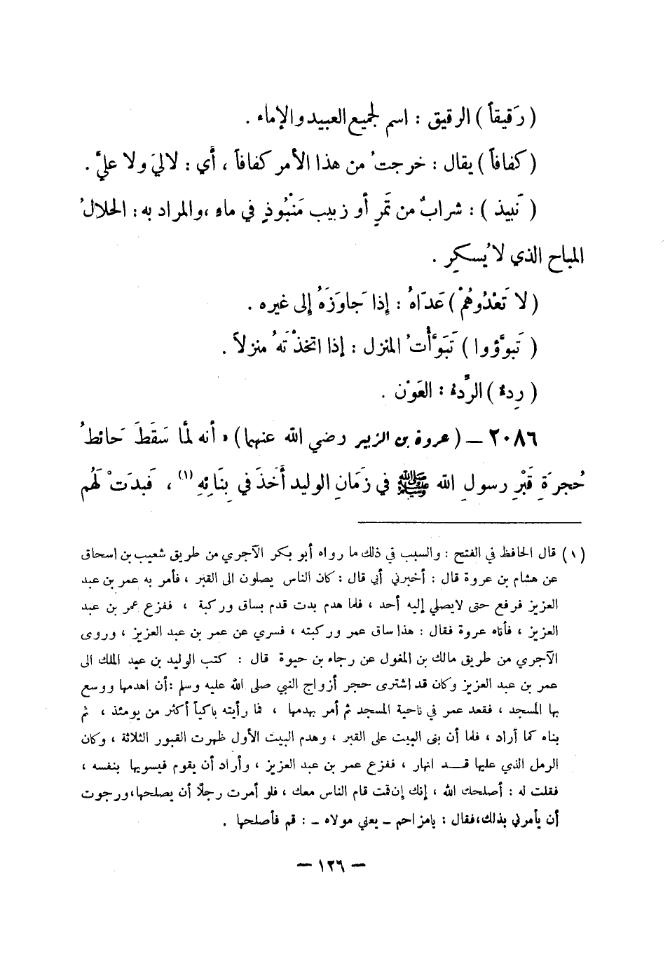 2086 - (خ) عروة بن الزبير - رضي الله عنهما -: «أَنه لمَّا سَقَطَ حَائطُ حُجْرَةِ قَبْرِ رسولِ الله -صلى الله عليه وسلم- في زَمَانِ الوليد أَخَذَ في بِنَائِهِ (¬1) ، فَبَدَتْ لَهُم -[127]- قَدَمٌ، فَفَزِعُوا، وظَنوا أَنَّها قَدَمُ رَسولِ الله - صلى الله عليه وسلم-، فما وجدوا أحداً يعلم ذلك، حتى قال لهم عروةُ: [لا] والله، ما هي قَدَمُ رسول الله - صلى الله عليه وسلم-، ومَا هي إلا قَدَمُ عُمَرَ» أخرجه ... (¬2) .