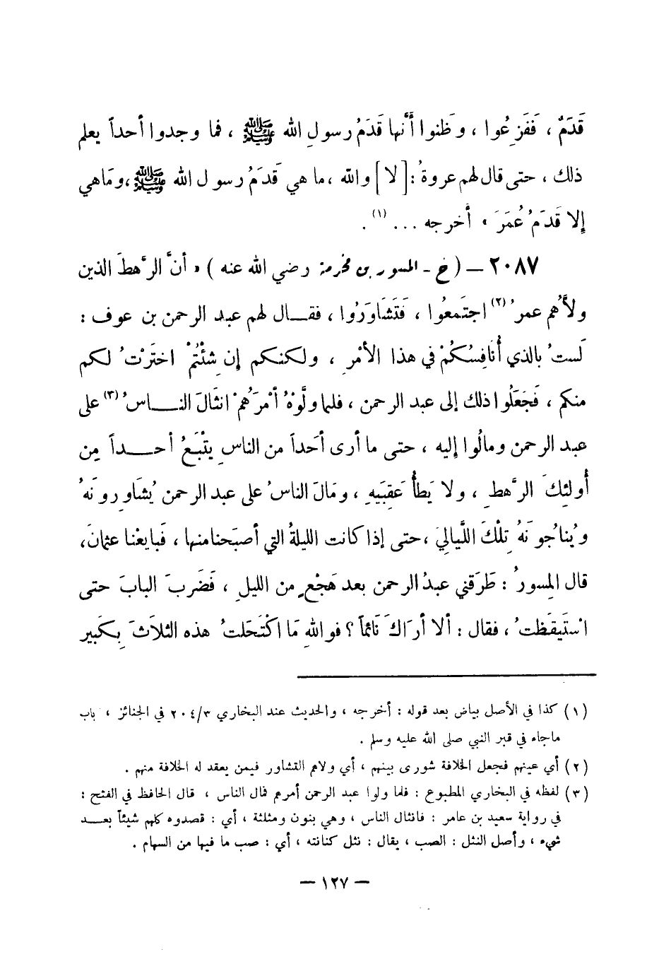 (¬2) لفظه في البخاري المطبوع: فلما ولوا عبد الرحمن أمرهم فمال الناس، قال الحافظ في " الفتح ": في رواية سعيد بن عامر: فانثال الناس، وهو بنون ومثلثة، أي قصدوه كلهم شيئاً بعد شيء، وأصل النثل: الصب، يقال: نثل كنانته، أي: صب ما فيها من السهام.