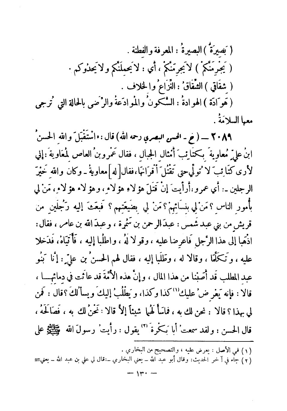 2089 - (خ) الحسن البصري - رحمه الله - قال: اسْتَقْبَلَ واللهِ الحسنُ بنُ عليّ مُعاوِيةَ بِكَتَائِبَ أَمْثالِ الجبالِ، فقال عَمْرو بنُ العاصِ لِمُعَاويةَ: إِنِّي لأرى كتَائِبَ لا تُولِّي حتى تَقْتُلَ أقْرَانَهَا، فقال [له] معاويةُ - وكان واللهِ خَيْرَ الرجلين -: أَي عمرو: «أَرأيتَ إنْ قَتَلَ هؤلاء هؤلاء، وهؤلاء هؤلاء، مَنْ لي بأُمورِ الناسِ؟ مَنْ لي بِنسَائِهِمْ؟ مَنْ لي بِضَيعَتِهم؟» فَبَعَثَ إليه رَجُلينِ من قريشٍ من بني عبد شَمس: عبدَ الرحمن بن سَمُرة، وعبدَ الله بن عامر، فقال: اذْهَبا إلى الرَّجلِ فَاعرِضَا عليه، وقولا لَهُ، واطلُبا إِليه، فَأَتَيَاهُ، فَدَخلا عليه، وتَكَلَّمَا، وقالا له، وطَلَبا إليه، فقال لهم الحسنُ بن عليٍّ: إنَّا بَنُو عبدِ المطلب قَد أَصَبْنا من هذا المال، وإِنَّ هذه الأمَّةَ قد عاثَت في دِمائِهِا، قالا: فإنه يَعْرِضُ عليك (¬1) كذا وكذا، ويَطْلُبُ إليكَ ويسألُكَ؟ قال: فَمَن لي بهذا؟ . قالا: نحن لك به، فما سَأَلَهُما شيئاً إلا قالا: نَحْنُ لك به، فَصَالَحَهُ، قال الحسن: ولقد سمعتُ أبا بَكْرَةَ (¬2) يقول: رأيتُ رسولَ الله - صلى الله عليه وسلم- على -[131]- المنبَرِ والحسنُ بنُ عليٍّ إلى جَنْبِهِ، وهو يُقْبِلُ على الناس مَرَّة، وعليه أخرى، ويقول: «إنَّ ابني هذا سَيِّدٌ، ولعَلَّ اللهَ أَنْ يُصلِحَ به بَيْنَ فِئتَينِ عَظِيمَتَينِ من المسلمين» أخرجه البخاري (¬3) .