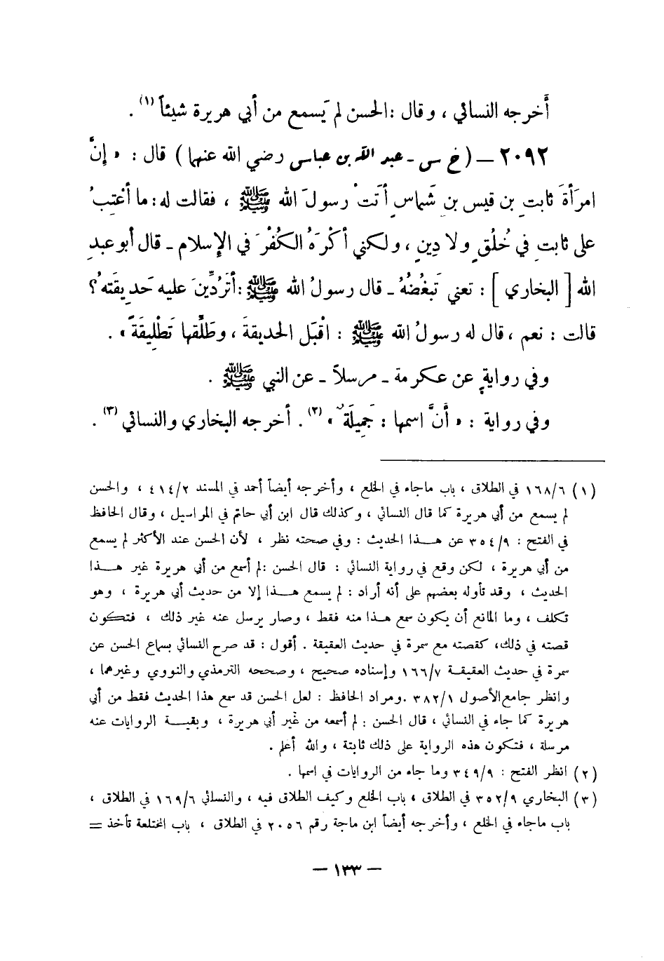 2092 - (خ س) عبد الله بن عباس - رضي الله عنهما -: قال: إِنَّ امرَأةَ ثابتِ بن قيس بنِ شَماسٍ أَتَتْ رسولَ الله - صلى الله عليه وسلم-، فقالت له: ما أعْتِبُ على ثابتٍ في خُلُقٍ، ولا دِينٍ، ولكني أكْرَهُ الكُفْرَ في الإسلام - قال أبو عبدِ الله [البخاري] : تَعني تَبغُضُهُ- قال رسولُ الله - صلى الله عليه وسلم-: «أَتَرُدِّينَ عليه حَدِيقَتَهُ؟» قالت: نعم، قال له رسولُ الله -صلى الله عليه وسلم-: «اقْبَل الحديقةَ، وطَلِّقها تَطْلِيقَة» .