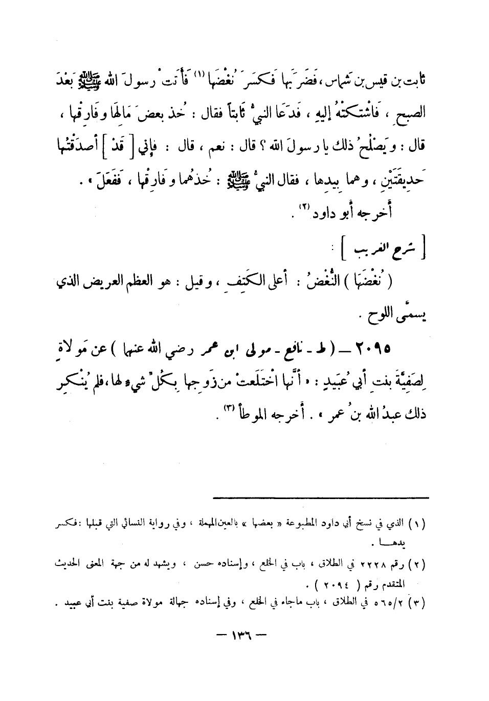 2095 - (ط) نافع مولى ابن عمر - رضي الله عنهما -: عن مَولاةٍ لِصَفيَّة بنت أبي عُبيد: «أنَّها اخْتَلَعتْ من زَوجِها بِكُلِّ شَيءٍ لها، فلم يُنْكِر ذلك عبدُ الله بنُ عمر» . أخرجه الموطأ (¬1) .