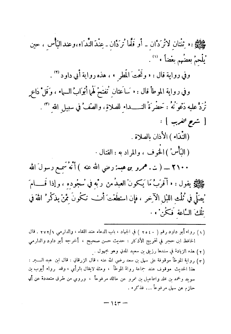 2100 - (ت) عمرو بن عبسة - رضي الله عنه -: أَنَّهُ سَمِع رسولَ الله -صلى الله عليه وسلم- يقول: «أَقْرَبُ مَا يَكُونُ العبدُ من ربِّهِ في سُجُودِهِ، وإذا قَامَ يُصَلِّي في ثُلُثِ الليْلِ الآخِرِ، فإِن استطَعْتَ أَن تكُونَ مِمَّنِ يَذكُرُ اللهَ في تِلْكَ السَّاعَةِ فَكُنْ» . -[144]-