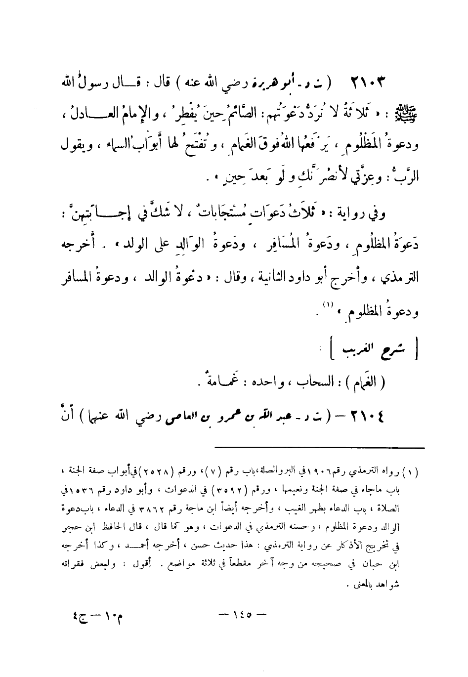 2104 - (ت د) عبد الله بن عمرو بن العاص - رضي الله عنهما -: أنَّ -[146]- النبيَّ - صلى الله عليه وسلم- قال: «مَا مِنْ دَعوةٍ أسرَعَ إجابَة (¬1) من دعوةِ غائِبٍ لِغَائِبٍ» . أخرجه الترمذي.