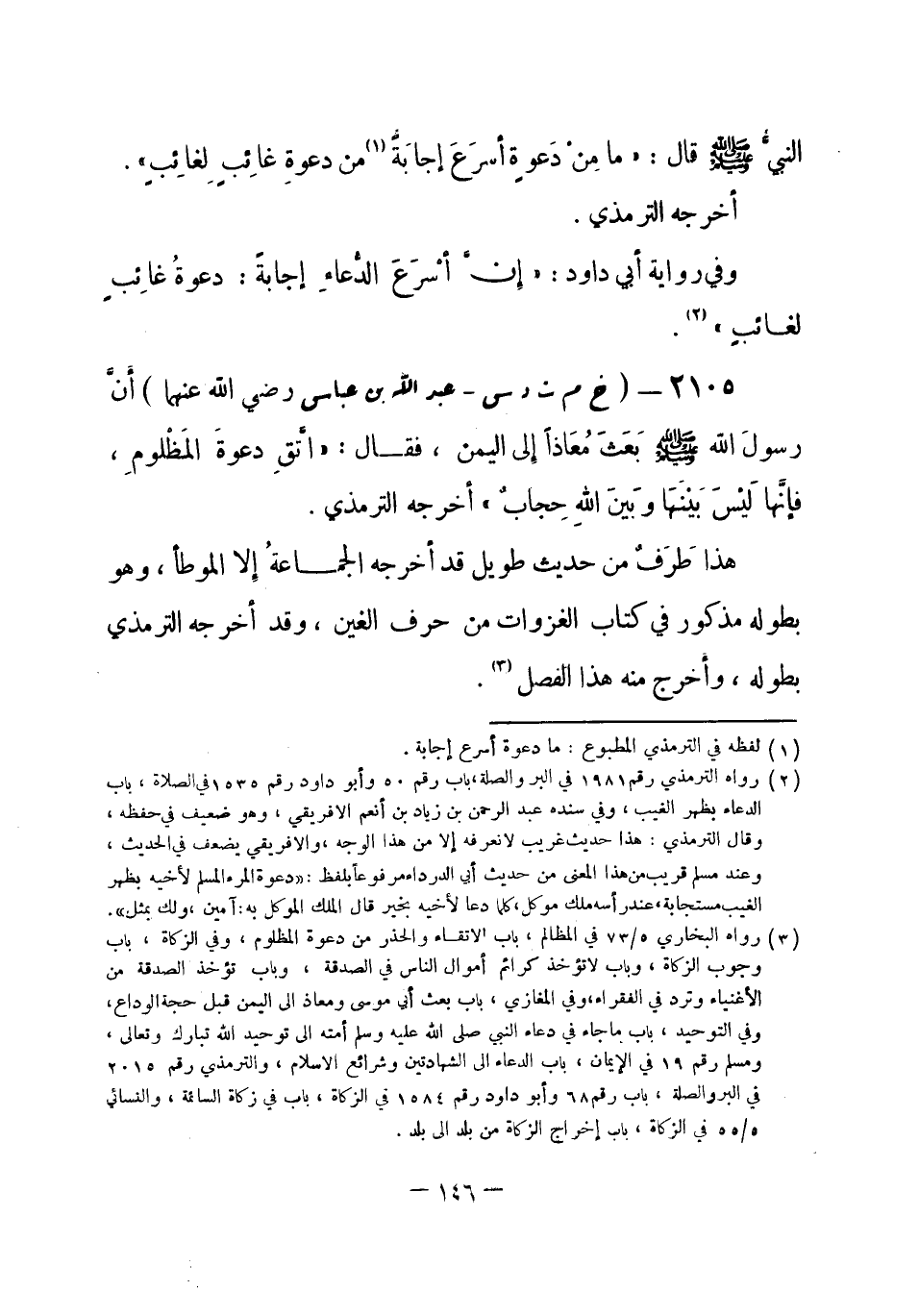 2105 - (خ م ت د س) عبد الله بن عباس - رضي الله عنهما -: أنَّ رسولَ الله - صلى الله عليه وسلم- بَعَثَ مُعَاذاً إلى اليمن، فقال: «اتَّقِ دعوةَ المَظْلومِ، فإنَّهَا لَيْسَ بَيْنَهَا، وَبَينَ اللهِ حِجَابٌ» . أخرجه الترمذي.