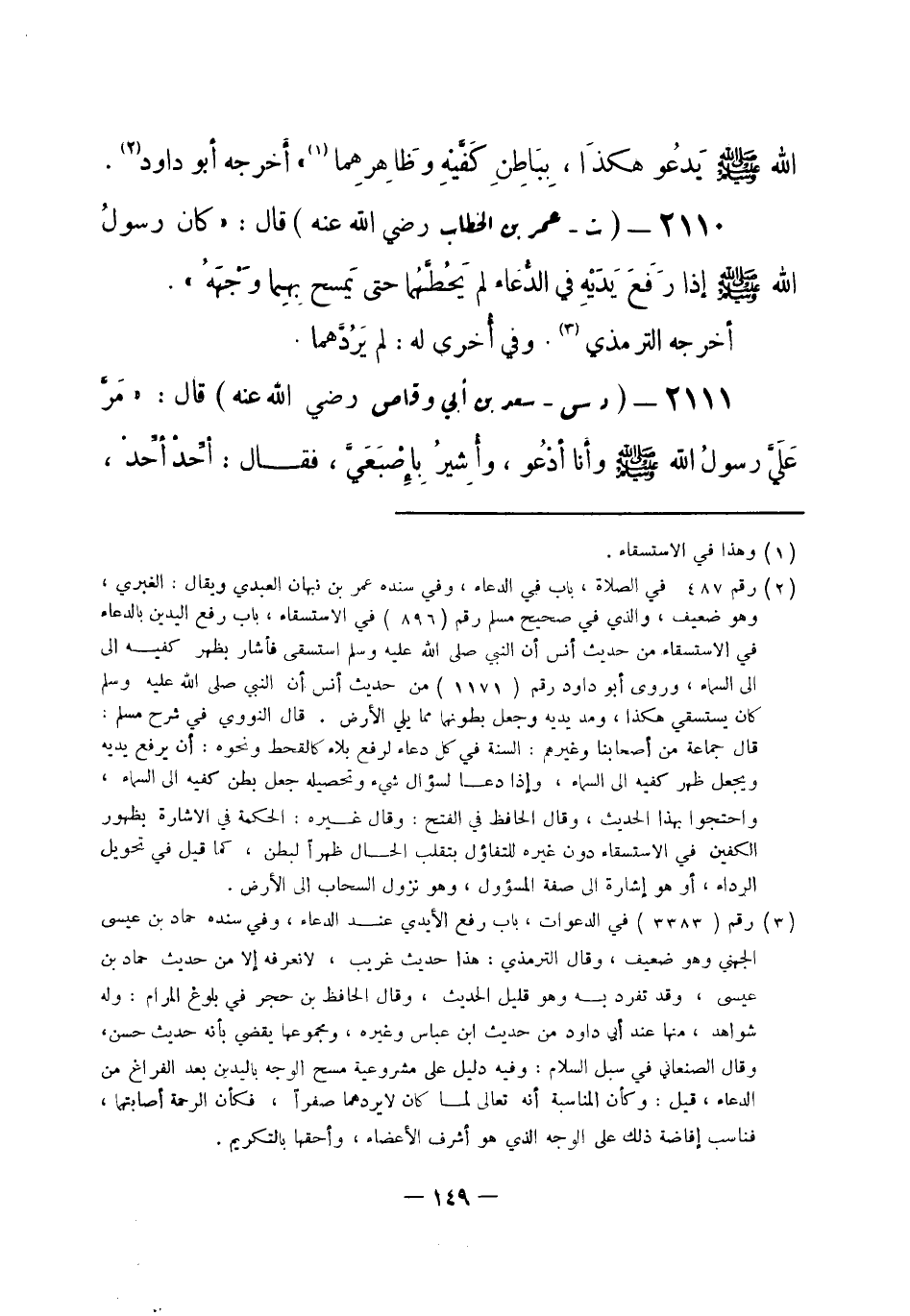 2110 - (ت) عمر بن الخطاب - رضي الله عنه -: قال: «كان رسولُ الله - صلى الله عليه وسلم- إذا رَفَعَ يَدَيْهِ في الدُّعَاءِ لم يَحُطَّهُمَا حتى يَمسح بِهِما وَجْهَهُ» . أخرجه الترمذي (¬1) . وفي أخرى له: لم يَرُدَّهما.