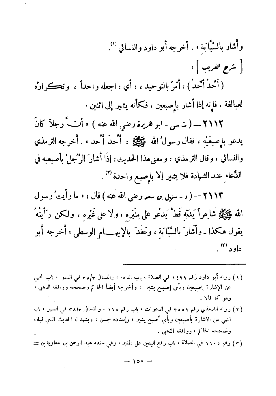 2112 - (ت س) أبو هريرة - رضي الله عنه -: «أَنَّ رَجلاً كانَ يَدعو بِإِصبَعَيْهِ، فقال رسولُ الله - صلى الله عليه وسلم-: أَحِّدْ أَحِّدْ» . أخرجه الترمذي، والنسائي.