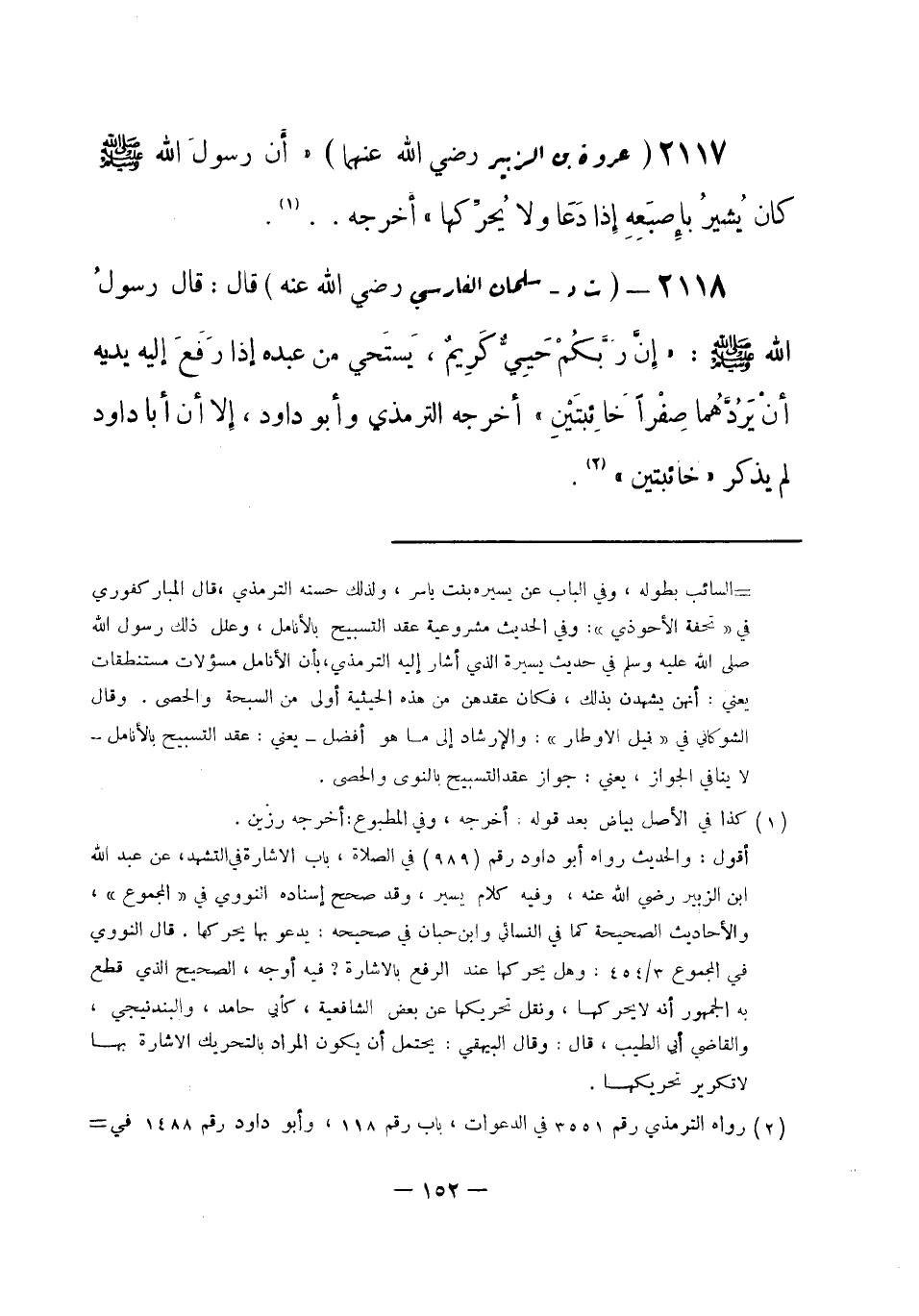 2117 - (د) عروة بن الزبير - رضي الله عنهما -: «أنَّ رسولَ الله -صلى الله عليه وسلم- كان يُشيرُ بإِصبَعِهِ إذا دَعَا ولا يُحرِّكها» . أخرجه ... (¬1) .