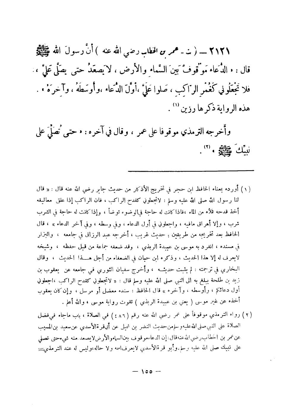 2121 - (ت) عمر بن الخطاب - رضي الله عنه -: أنَّ رسولَ الله - صلى الله عليه وسلم- قال: «الدُّعَاء مَوْقُوفٌ بَينَ السَّماءِ والأرض، لا يَصعَدُ حتى يَصَلَّى عَلَيَّ، فلا تَجْعَلُوني كَغُمْرِ الرَّاكِبِ، صَلوا عَلَيَّ، أوَّلَ الدُّعَاءِ، وأَوسَطَهُ، وآخِرَهُ» هذه الرواية ذكرها رزين (¬1) .