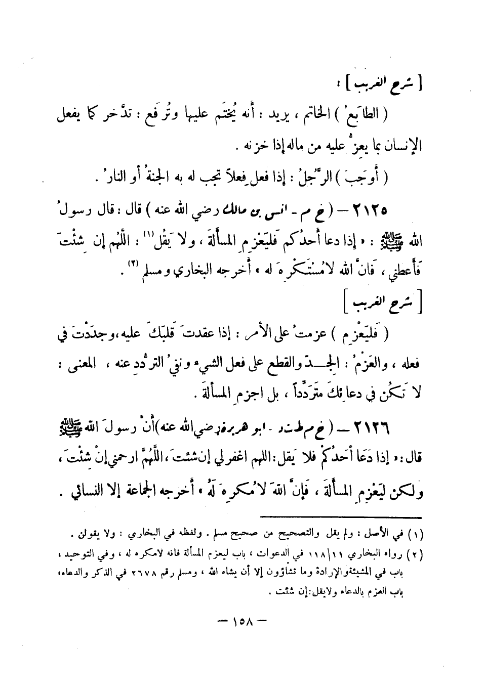 (¬2) رواه البخاري 11 / 118 في الدعوات، باب ليعزم المسألة فإنه لا مكره له، وفي التوحيد، باب في المشيئة والإرادة وما تشاؤون إلا أن يشاء الله، ومسلم رقم (2678) في الذكر والدعاء، باب العزم بالدعاء ولا يقل: إن شئت.