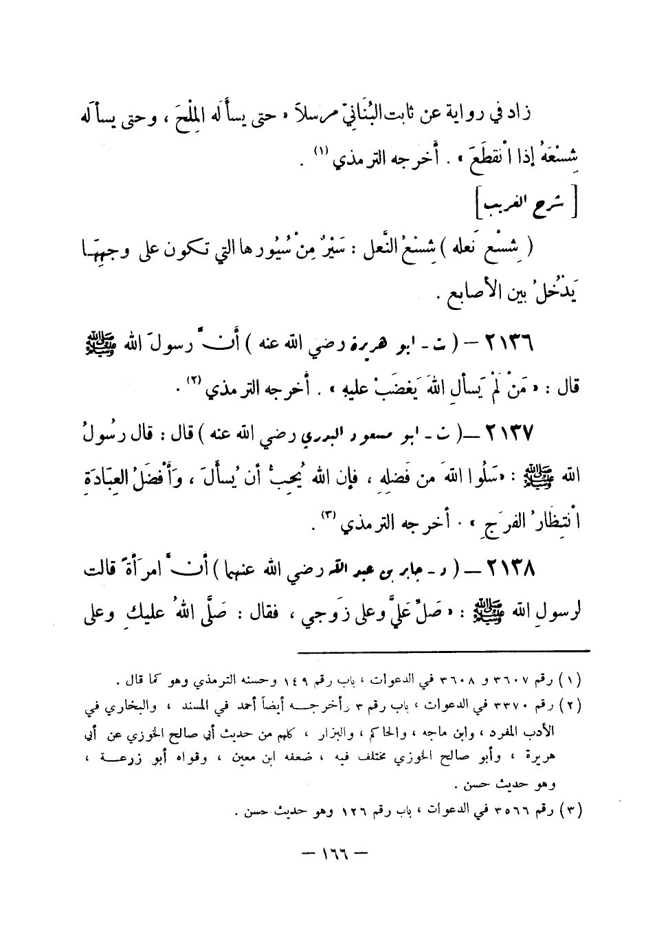 2137 - (ت) أبو مسعود البدري - رضي الله عنه -: قال: قال رَسُولُ الله - صلى الله عليه وسلم-: «سَلُوا اللهَ من فَضْلِهِ، فإن الله يُحِبُّ أَن يُسأَلَ، وَأَفْضَلُ العِبَادَةِ انْتِظَارُ الفَرجِ» . أخرجه الترمذي (¬1) .