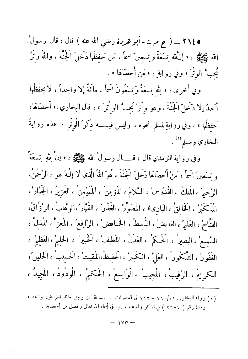 2145 - (خ م ت) أبو هريرة - رضي الله عنه -: قال: قال رسولُ الله -صلى الله عليه وسلم-: «إِنَّ للهِ تِسْعَة، وِتِسعِينَ اسماً، مَن حَفِظَها دَخَلَ الجَنَّةَ، واللهُ وِتْرٌ يُحِبُّ الوِتْرَ» . وفي رواية: «مَن أَحصَاهَا» .