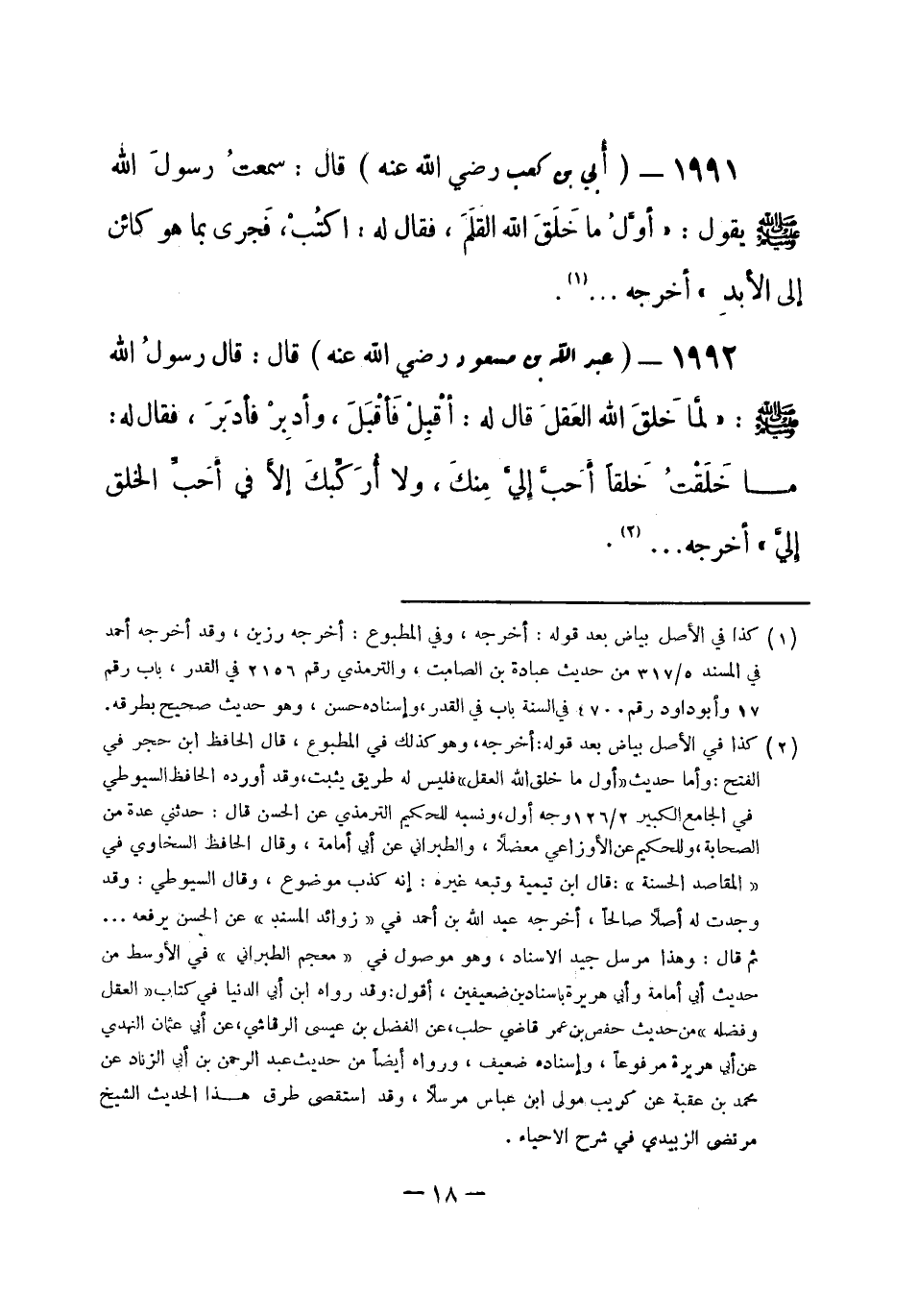 1992 - () عبد الله بن مسعود - رضي الله عنه -: قال: قال رسول الله -صلى الله عليه وسلم-: «لَمَّا خَلقَ اللهُ العَقلَ قال له: أقْبِلْ فَأقْبَلَ، وَأدبِرْ فَأدبَرَ، فقال له: ما خَلَقْتُ خَلقاً أحبَّ إِليَّ مِنكَ، وَلا أُرَكِّبَكَ إِلا في أحَبِّ الخلق إليَّ» أخرجه ... (¬1) .