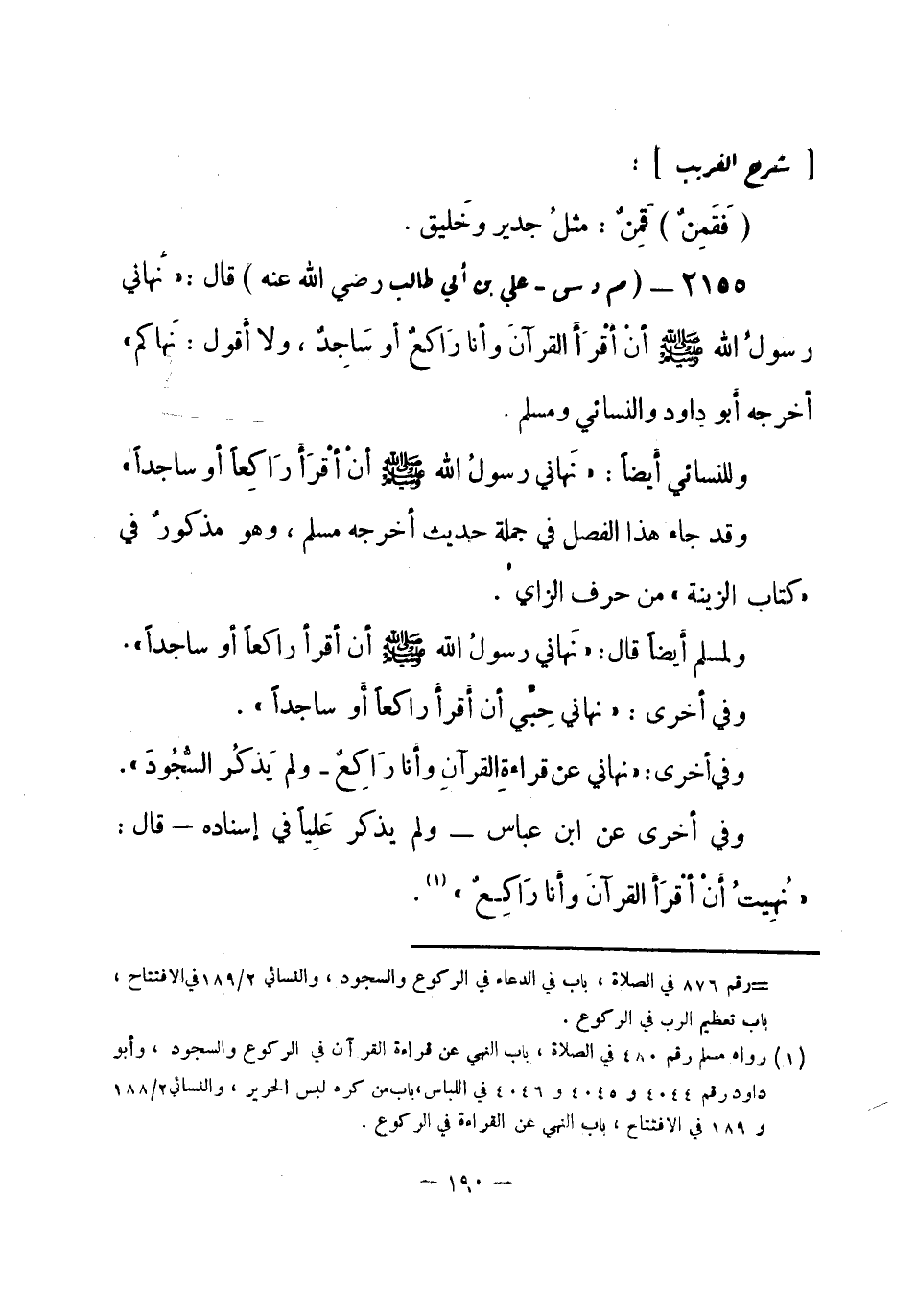 2155 - (م د س) علي بن أبي طالب - رضي الله عنه -: قال: «نَهاني رسولُ الله - صلى الله عليه وسلم- أنْ أَقْرَأَ القرآنَ وَأنَا رَاكِعٌ أو سَاجِدٌ، ولا أقول: نَهاكم» .