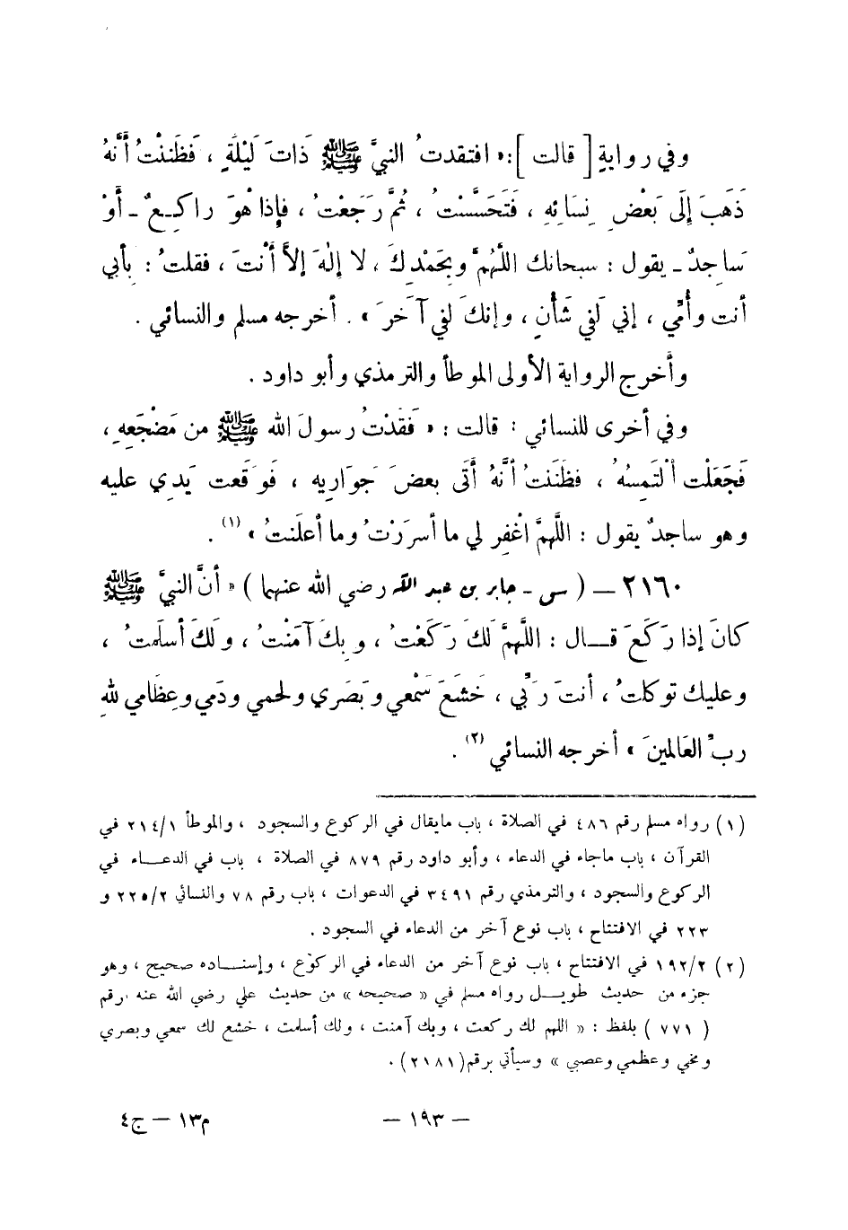 2160 - (س) جابر بن عبد الله - رضي الله عنهما -: «أنَّ النبيَّ-صلى الله عليه وسلم- كانَ إذَا رَكَعَ قال: اللَّهمَّ لَكَ رَكَعْتُ، وبِكَ آمَنْتُ، وَلَكَ أسلَمتُ، وعليك توكلتُ، أنتَ رَبِّي، خَشَعَ سَمعِي، وَبَصَري، ولحمي، ودَمي، وعِظَامي للهِ ربِّ العَالمينَ» . أخرجه النسائي (¬1) .
