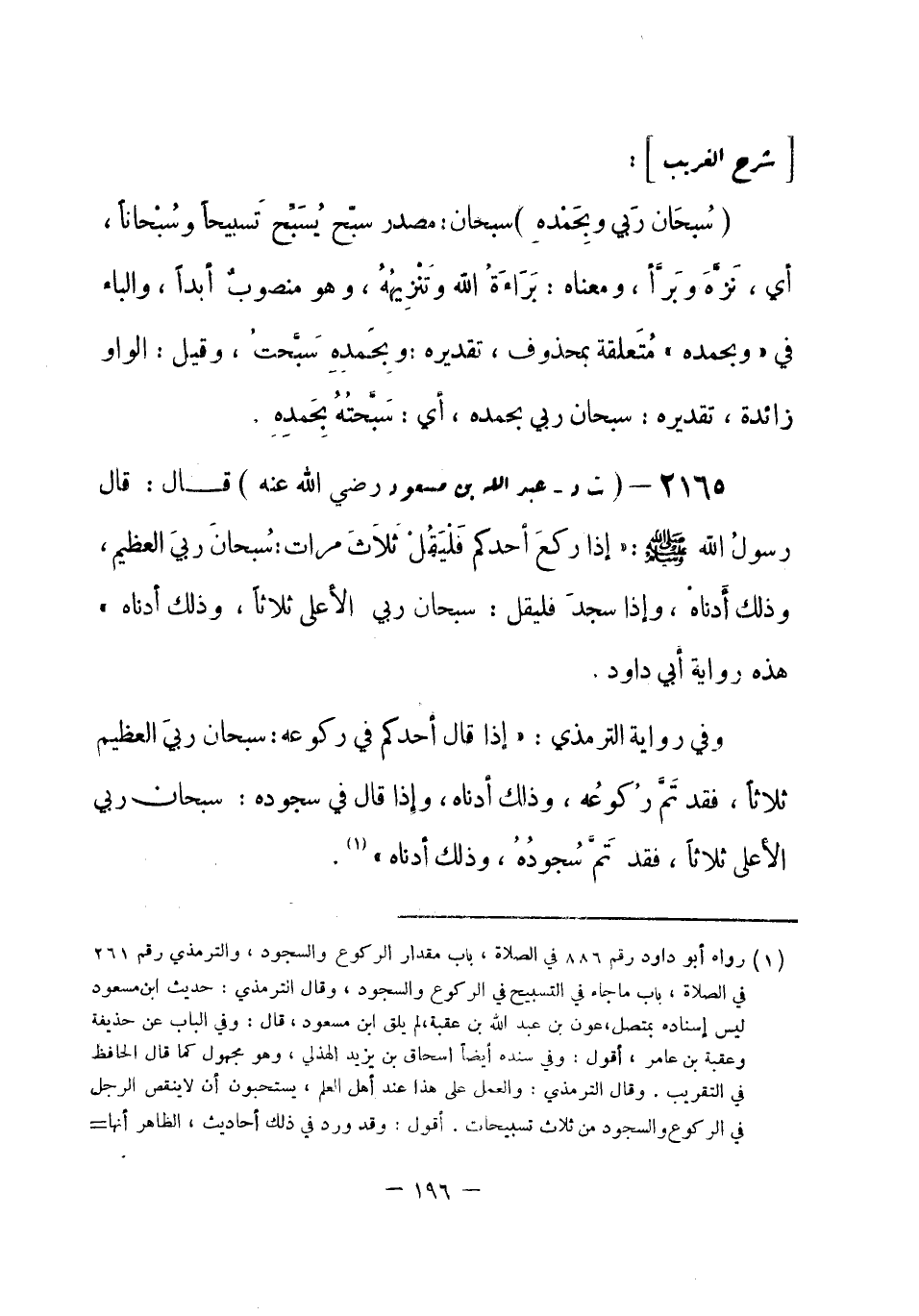 2165 - (ت د) عبد الله بن مسعود - رضي الله عنه -: قال: قال رسولُ الله - صلى الله عليه وسلم-: «إذا ركعَ أحدكم فَلْيَقُل ثَلاثَ مرات: سُبحانَ ربيَ العظيم، وذلك أَدناهُ، وإذا سجدَ فليقل: سبحان ربيَ الأعلى ثلاثاً، وذلك أدناه» . هذه رواية أبي داود.
