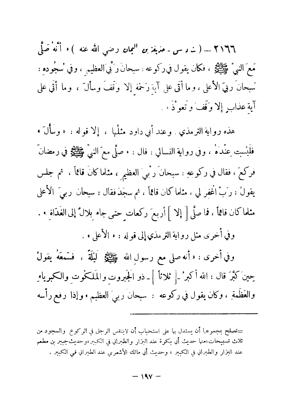 2166 - (ت د س) حذيفة بن اليمان - رضي الله عنه -: «أَنَّهُ صَلَّى مَعَ النبيِّ - صلى الله عليه وسلم- فكان يقول في ركوعه: سبحانَ رَبِّيَ العظيمِ، وفي سُجُودِهِ: سُبحانَ رَبيَ الأعلى، وما أَتى على آيةِ رَحْمةٍ إلا وَقَفَ وسأَلَ، وما أَتَى على آيةِ عذابٍ إلا وَقَفَ وتَعَوَّذَ» .